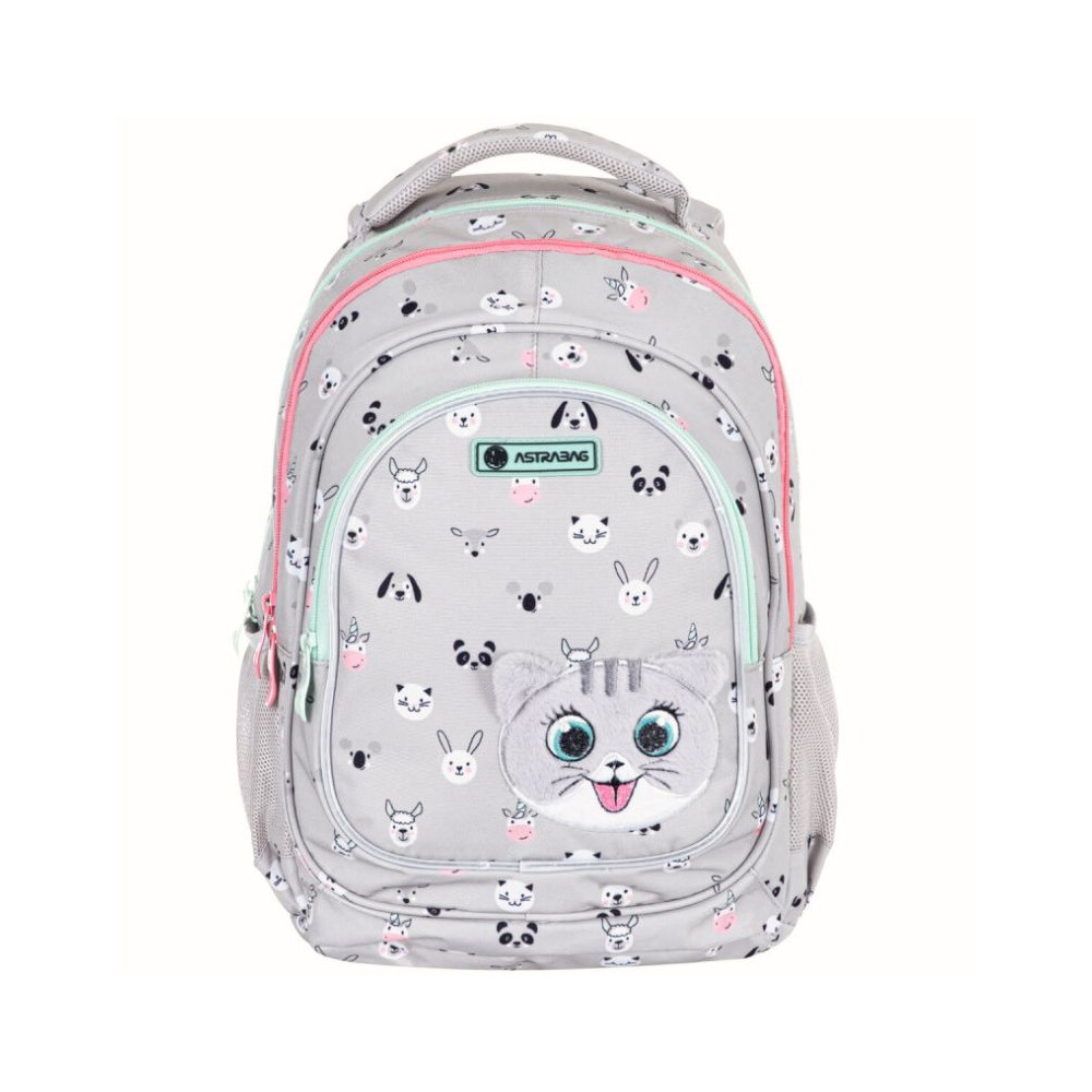 AstraDie Dreikammer-Rucksacktasche wurde für alle Katzenliebhaber entworfen. Auf der Vorderseite befindet sich ein aufgenähtes Plüsch-Schnurrgesicht, das sich kuschelig anfühlt. Außerdem lässt das graue Farbschema mit den Pastelltönen Rosa und Mint jedes Mädchenherz höher schlagen. Der Rucksack verfügt über drei geräumige Fächer mit viel praktischem Stauraum. Er ist mit der einzigartigen Ergo Back-Technologie ausgestattet, die den Druck auf Schultern und Wirbelsäule minimiert und dafür sorgt, dass sich Ihr Kind wohlfühlt.
