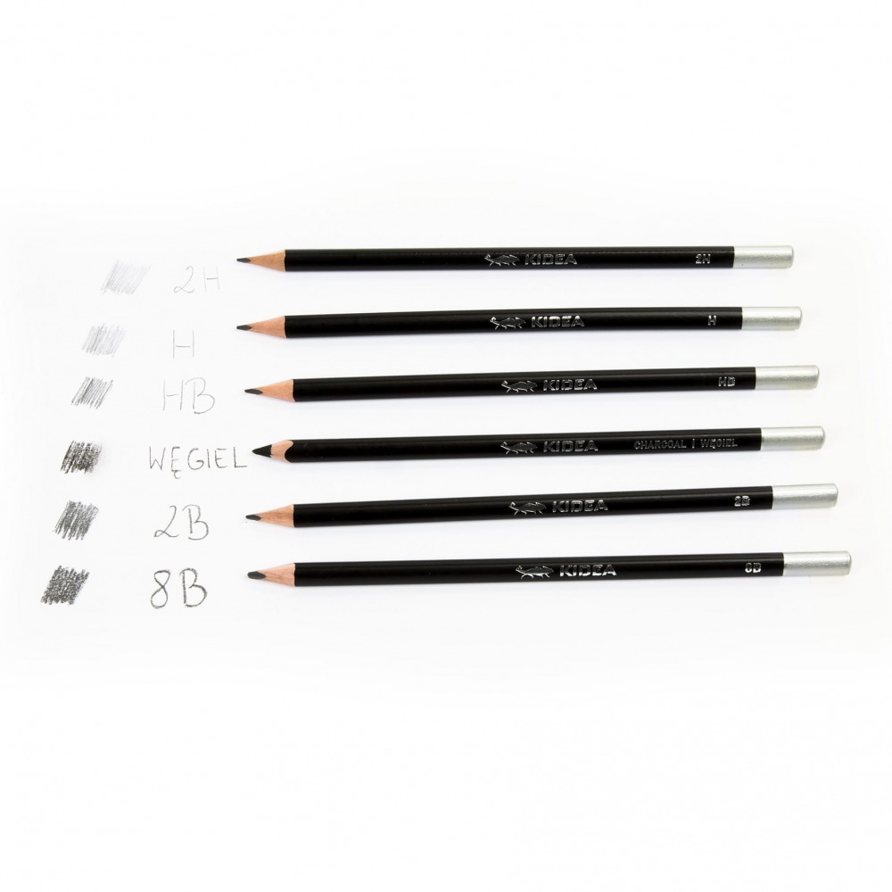 - Ein Set mit Bleistiften verschiedener Härtegrade und Kidea Zeichenkohlen.