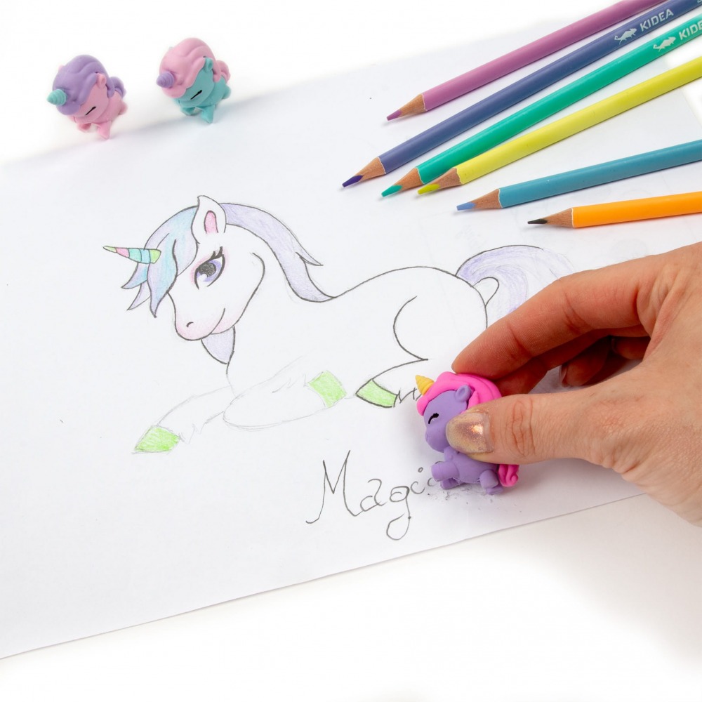 • Das Set Einhorn-Bleistifte von Kidea umfasst fünf Pastellfarben: Rosa, Lila, Blau, Grün und Gelb, einen Bleistift mit HB-Stifthärte und drei Radiergummis in Form von verschiedenfarbigen Einhörnern.