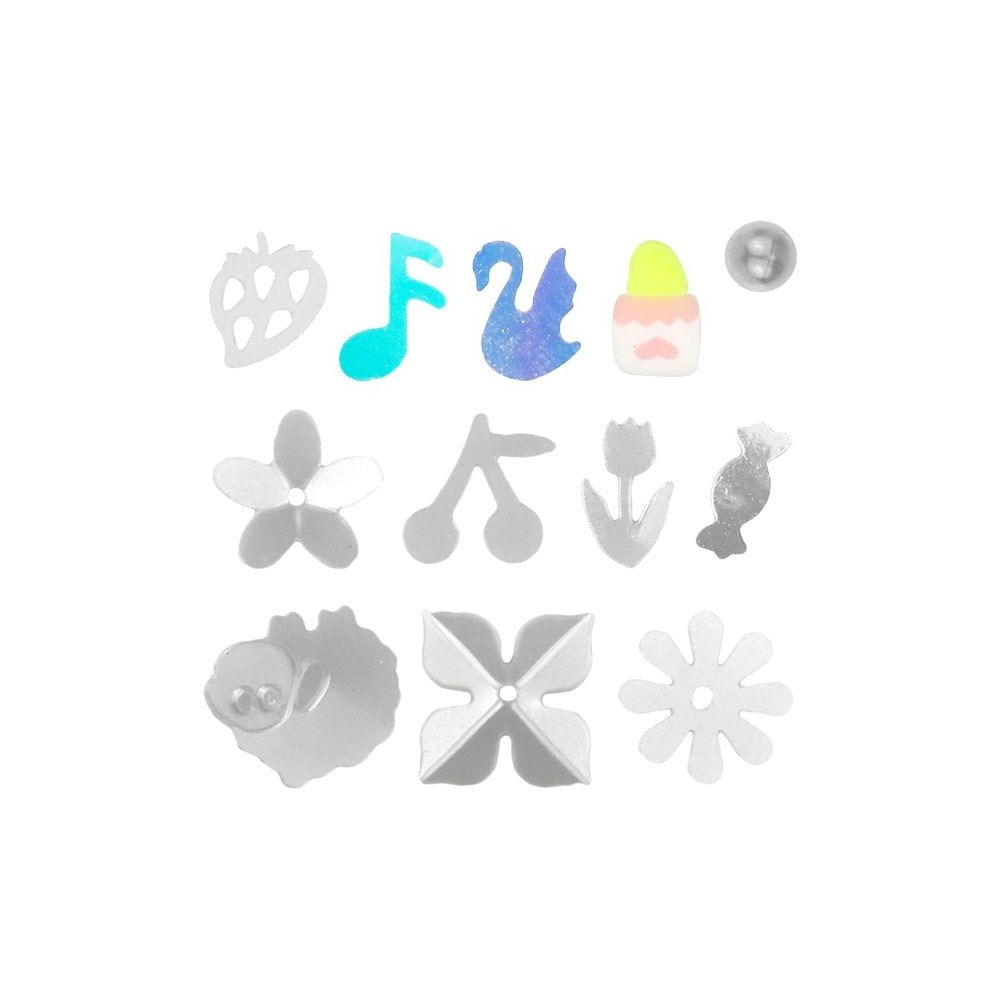 • Das Set besteht aus: Perlen 4mm, Pailletten flache Blume 10mm, konvexe Blumen 2 Muster 10mm, Konfetti Erdbeere 5 x 7mm, Kirschen 10 x 9mm, Note 6 x 9mm, Schwan 6 x 8mm, Bonbon 8 x 3mm, Schaf 12 x 11mm, doppelseitige Avocado 5 x 6, 6 x 8mm 14g weißer Ton.