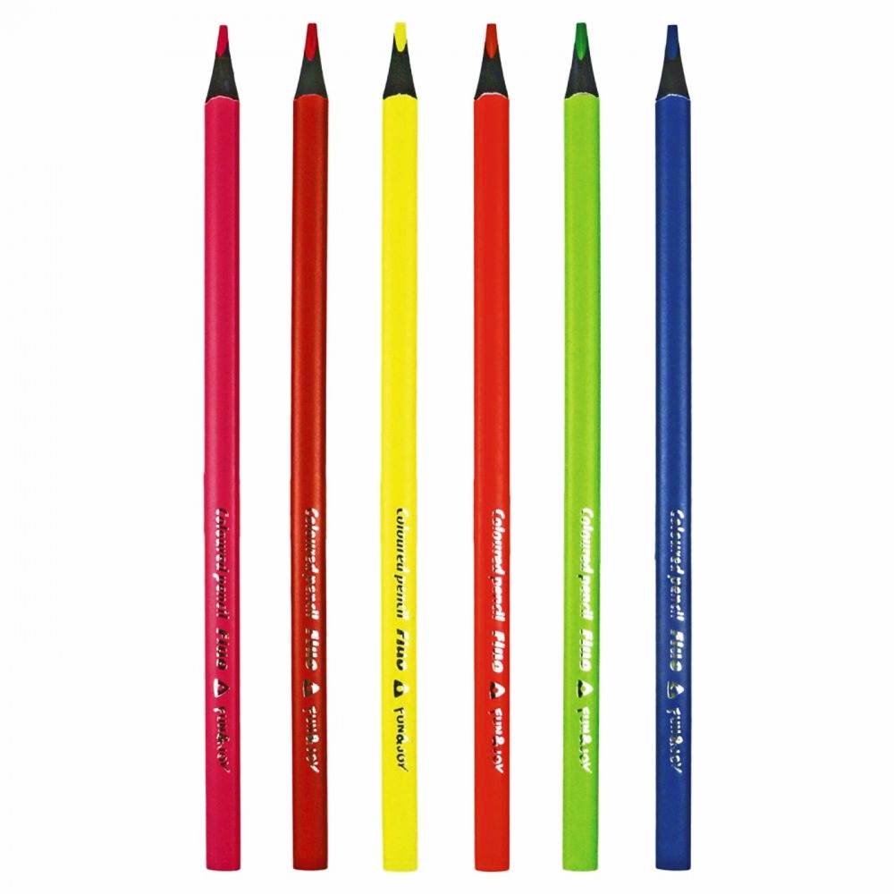 • Set aus 6 dreieckigen Stiften in intensiv fluoreszierenden Farben.