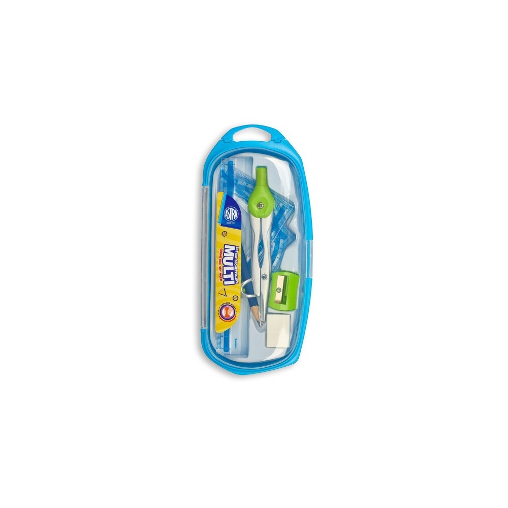 • Set beinhaltet: Metallkompass, Bleistift, Lineal 15 cm, zwei Geodreiecke, Winkelmesser, Spitzer, Radiergummi