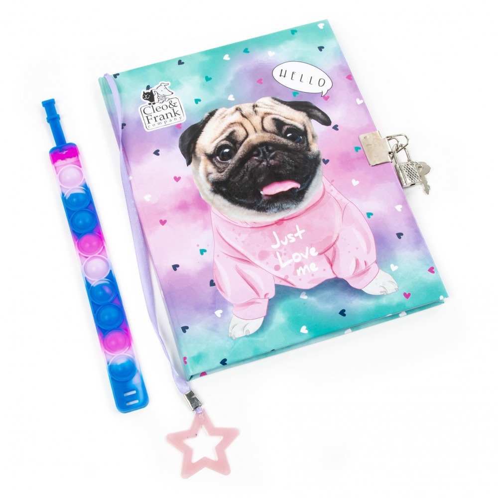 Tagebuch mit Vorhängeschloss und Armband PopIt Cleo und Frank der Hund Derform