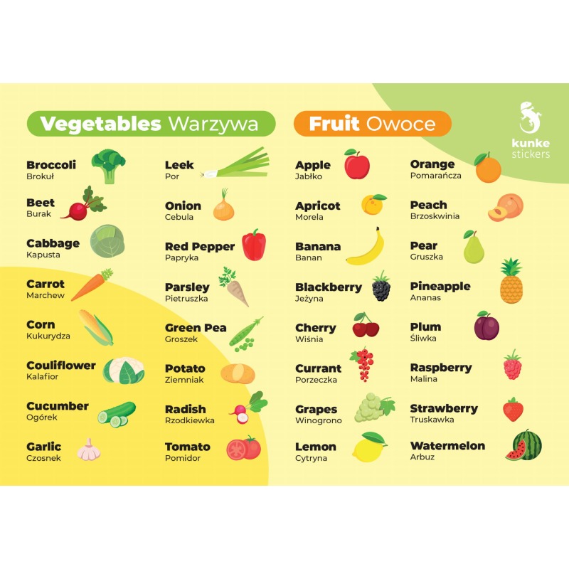Naklejki elektrostatyczne Fiszki do języka angielskiego Owoce i Warzywa Kunke
