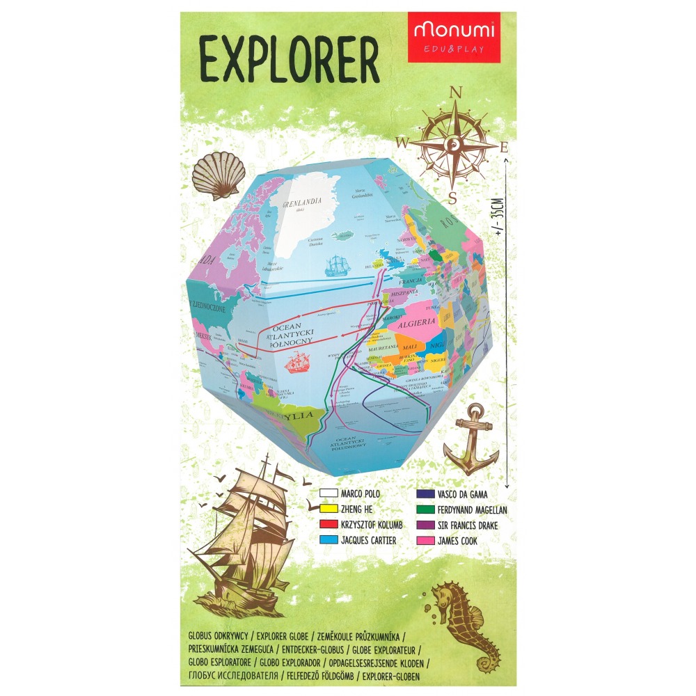 • Der Globus zeigt den Planeten mit markierten Routen der größten Entdecker wie Christopher Columbus, Marco Polo, Ferdinand Magellan, Sir Francis Drake, James Cook, Zheng He, Jacques Cartier, Vasco Da Gama. Zusätzlich sind Länder markiert.