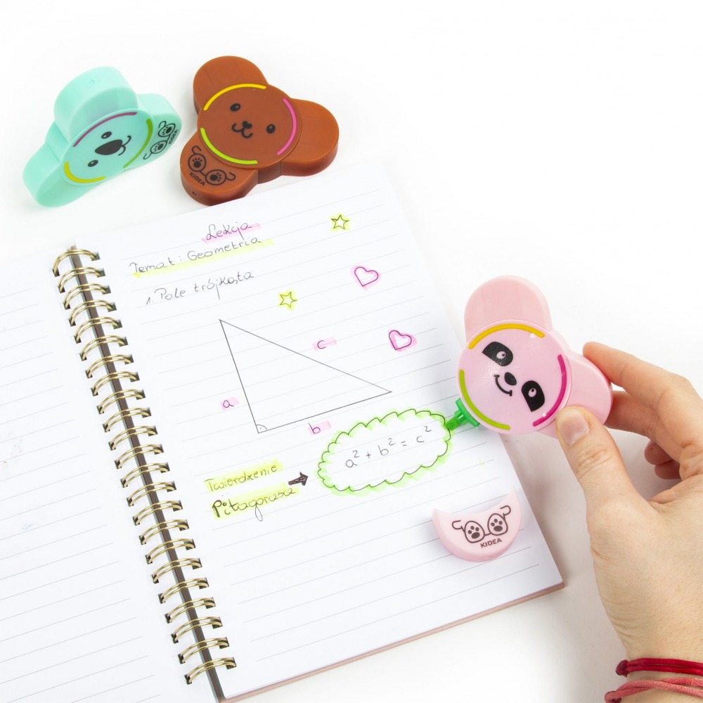 • In einem Textmarker mit einem Tier - einem Teddybär, einem Koala oder einem Faultier - befinden sich gleich drei Farben mit Neonspitzen: gelb, grün und rosa.