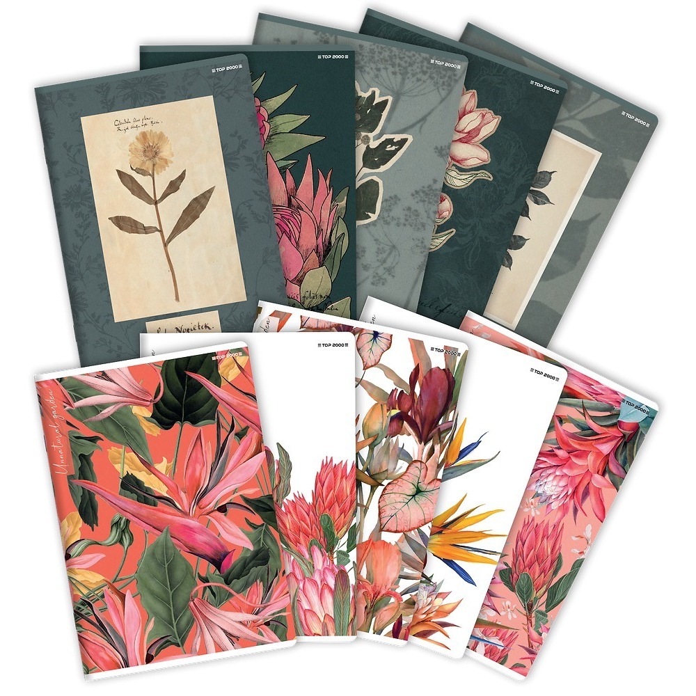 A collection of notebooks inspired by botany in an exotic and traditional way - combining 2 completely different illustration styles. 5 covers show subdued color engravings, as if taken out of an old classic. Another 5 feature exotic flowers in intense colors on a white or coral background. All illustrations are individually designed, making them unique and one-of-a-kind. Find your favorite cover from the Flowers collection and stand out in the classroom!