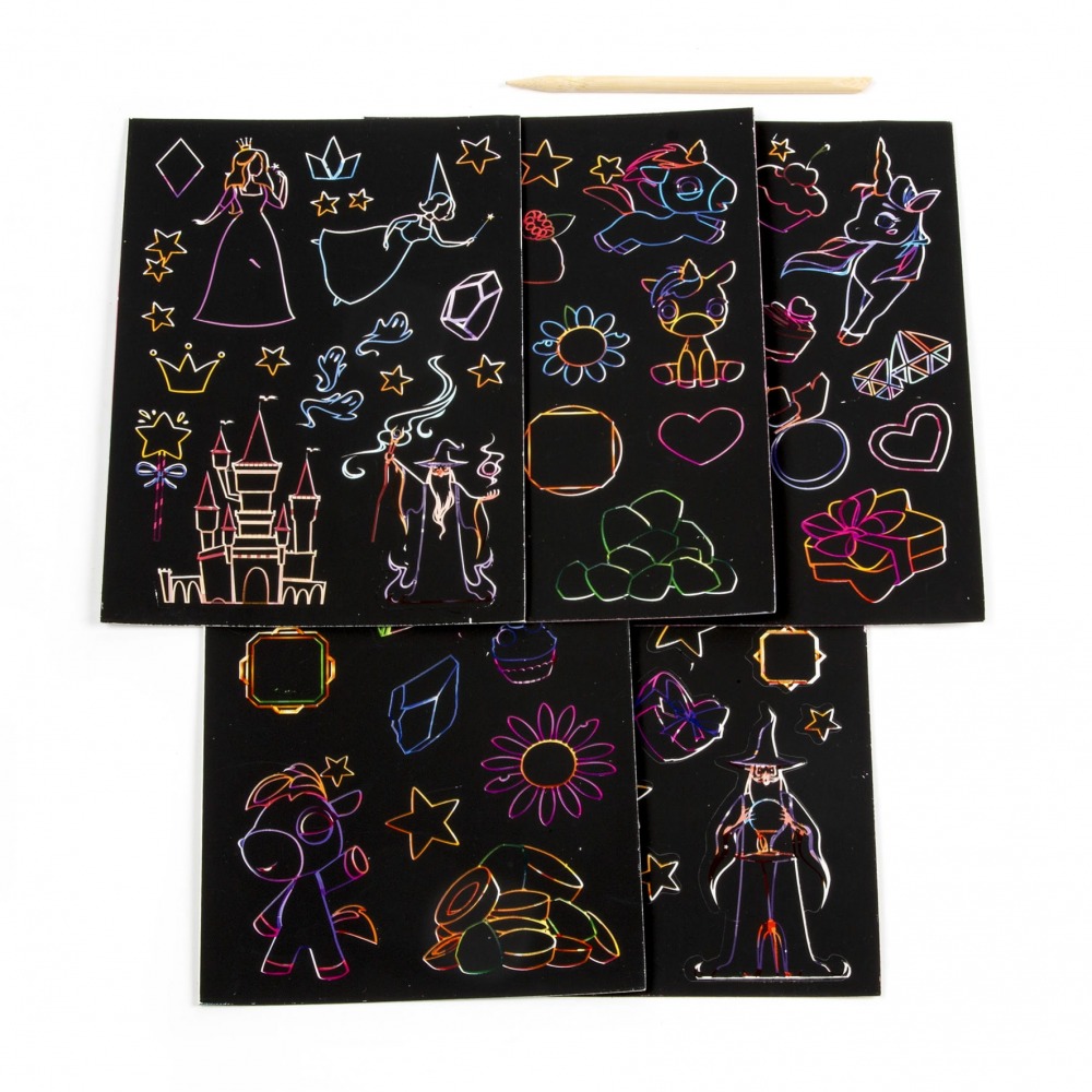 • Contains 4 cards with 40 colorful sticker-scratchers and a bamboo stylus.