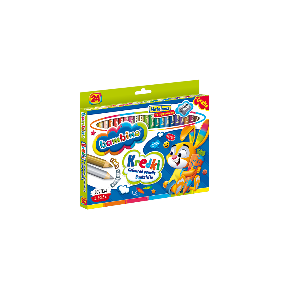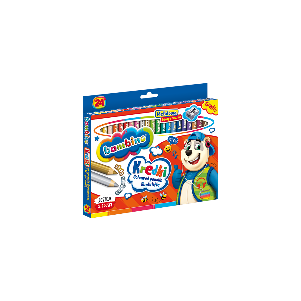 High-quality crayons made of kaolin clay in a wooden frame. They are characterized by exceptionally intense and saturated colors. They cover perfectly, they are perfect for drawing, filling large surfaces and making soft transitions between colors. The crayons are thick and well-balanced, which makes them ideally suited to a child's small hand. They are produced in Poland, in accordance with the Directive of the European Parliament and of the Council on the safety of toys and the ordinance of the Ministry of Economy on essential requirements for toys, which guarantees the safety of Bambino crayons.