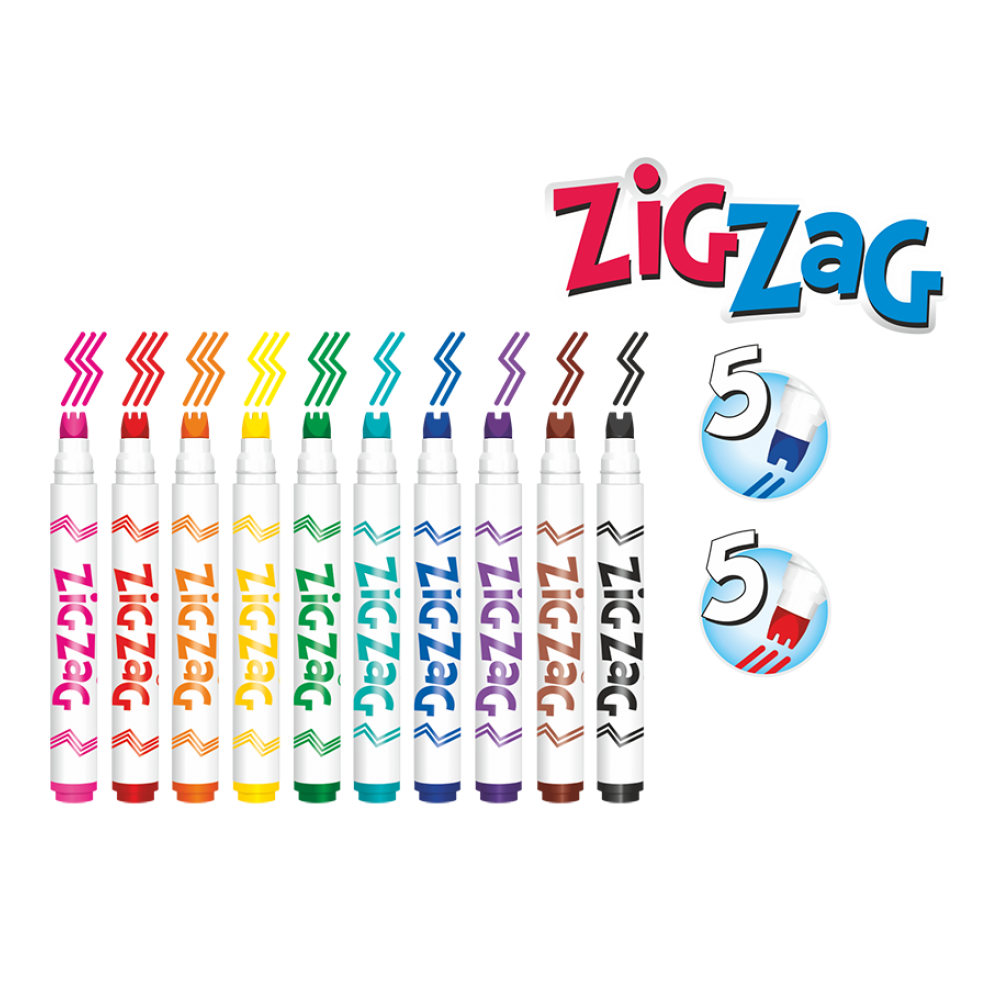 • ZIG ZAG markers in 10 colors, with two different tips for drawing two or three lines simultaneously.