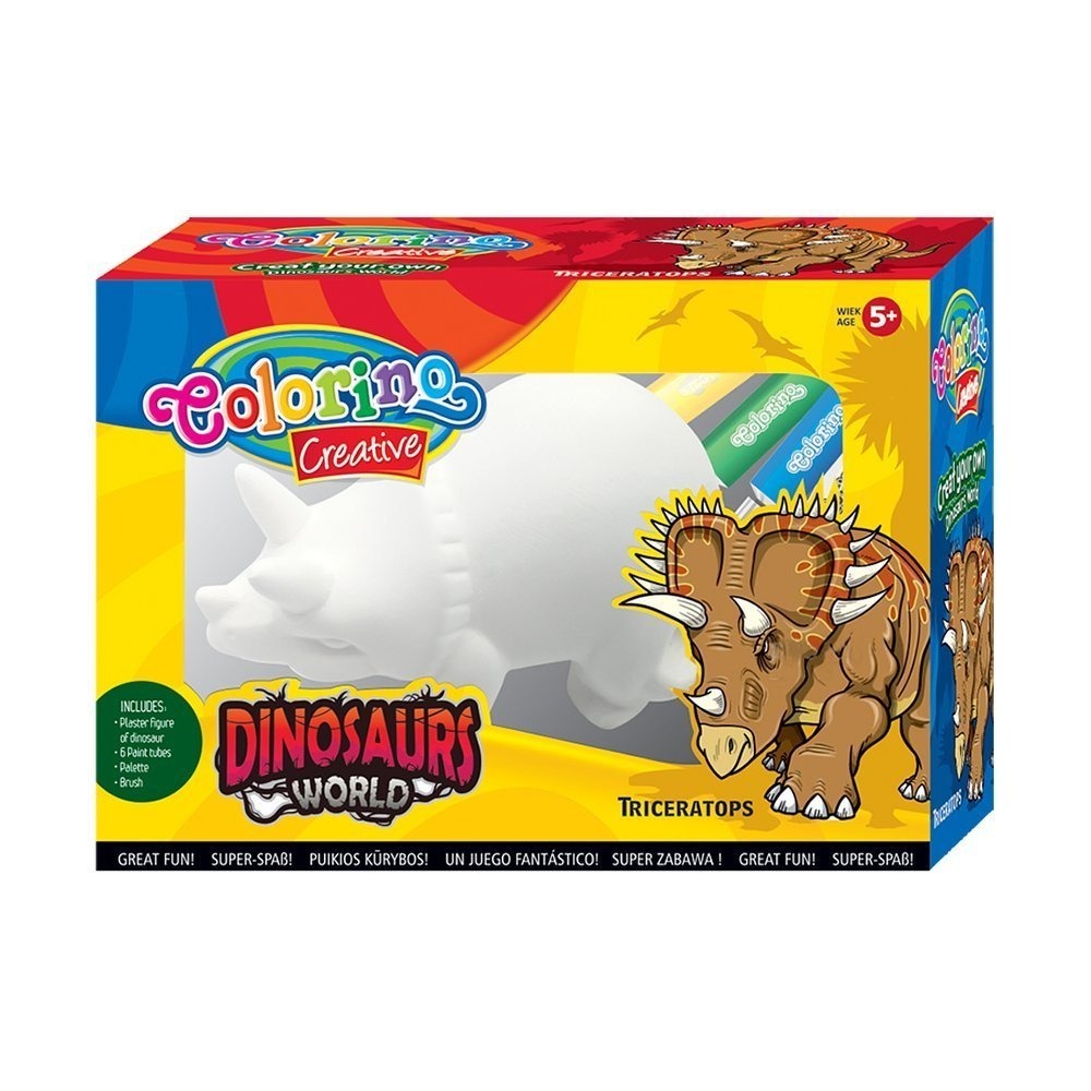A creative kit with a plaster dinosaur figurine, including all the accessories necessary for play.