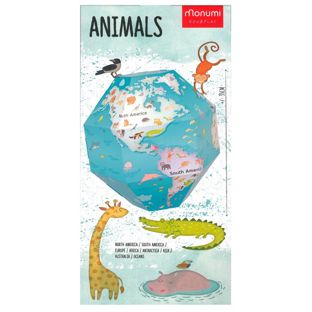 • The globe shows a planet with pictures of animals found on all continents and oceans.