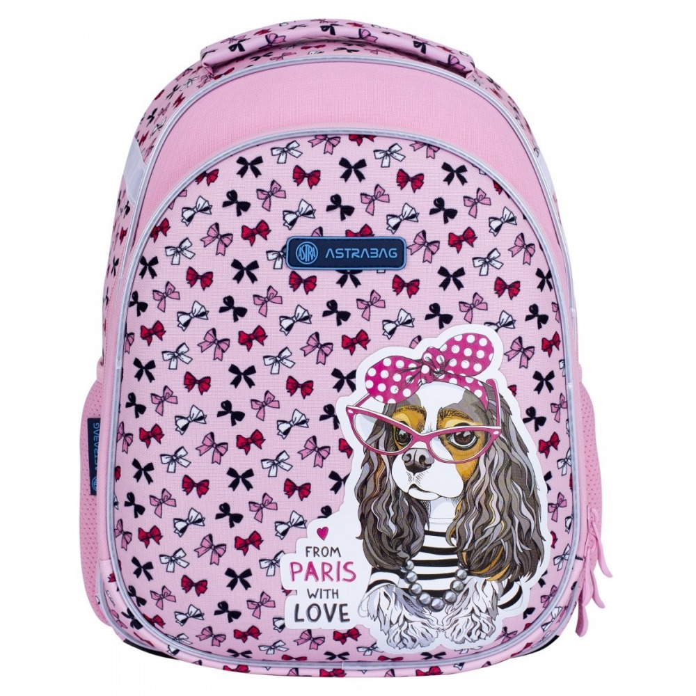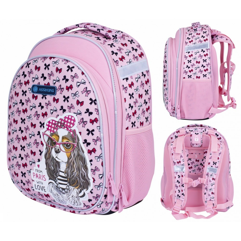 The term French doggie has just acquired a new meaning. The Astra bag satchel with a charming graphic motif depicting a fashionable Parisian spaniel will steal the heart of every girl who loves dogs and roses. The school satchel has a spacious main compartment with a compartment that can accommodate several notebooks and textbooks. It uses the latest Ergo Back technology to minimize pressure on the shoulders and spine, and to ensure the child's sense of comfort. Thanks to it, the weight on the back is evenly distributed without putting pressure on the shoulders.