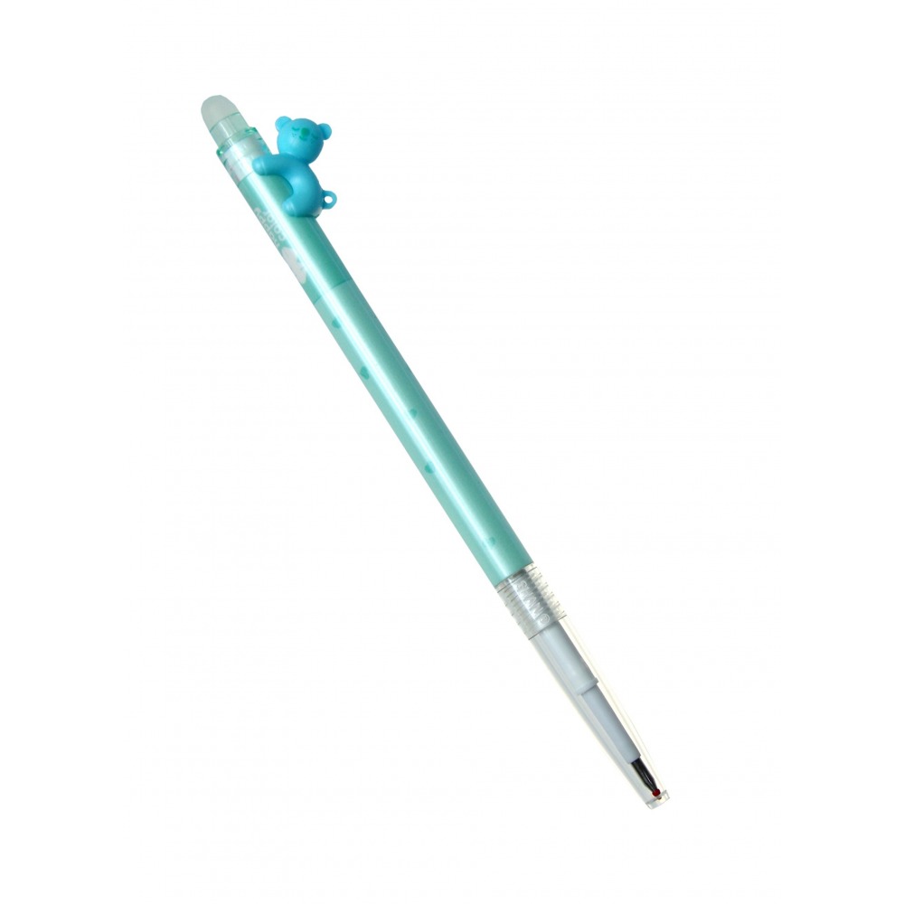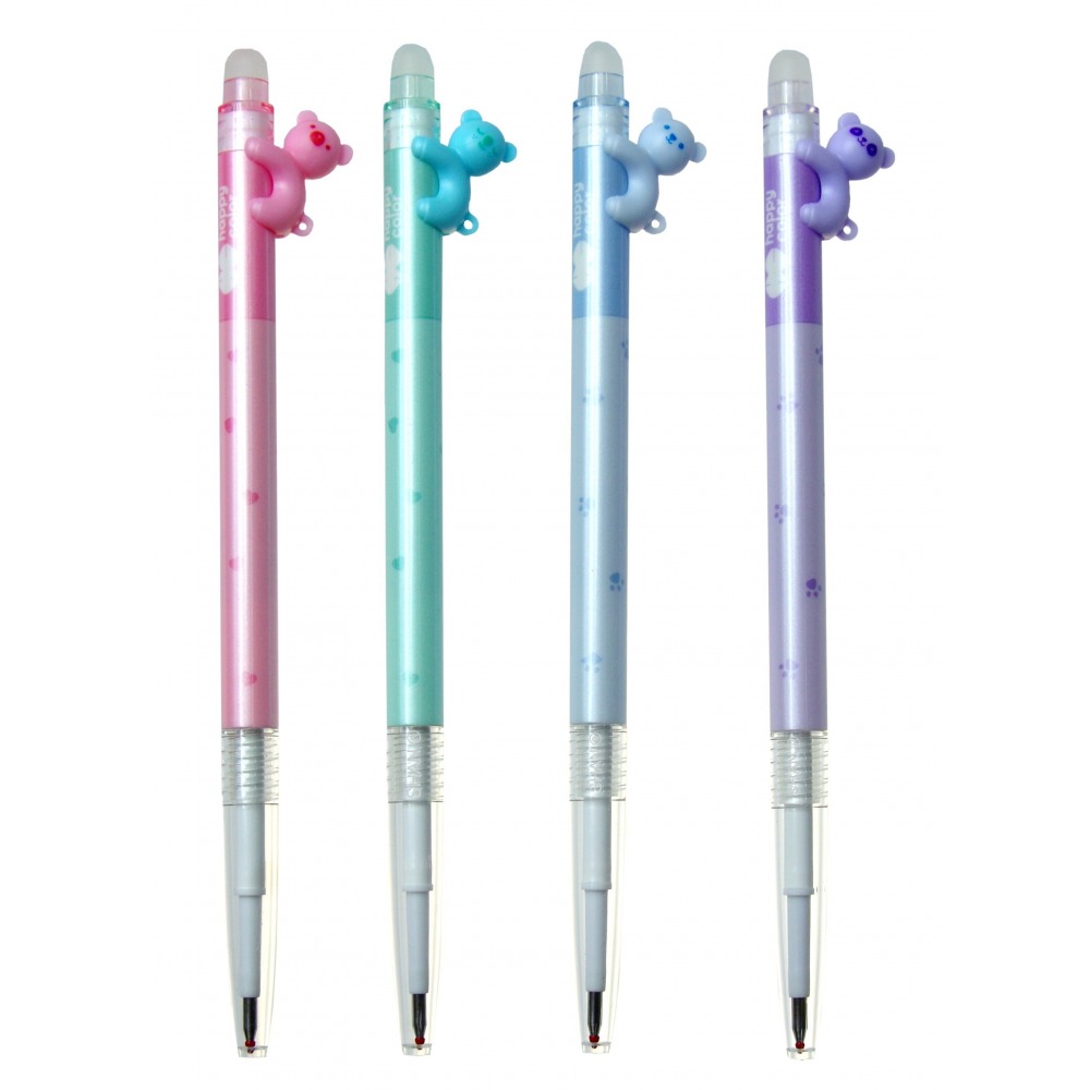 • Erasable gel pen "Znikopis" in a pastel casing with a button in the shape of a teddy bear.