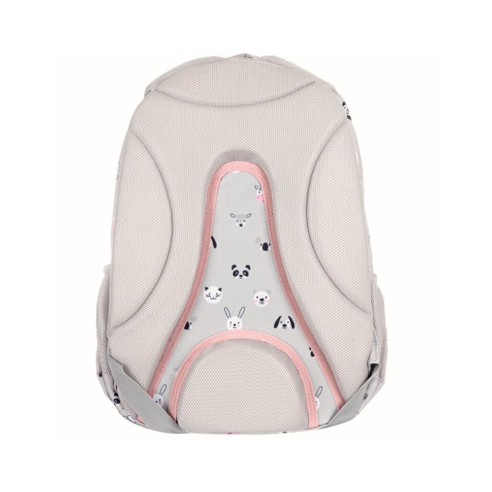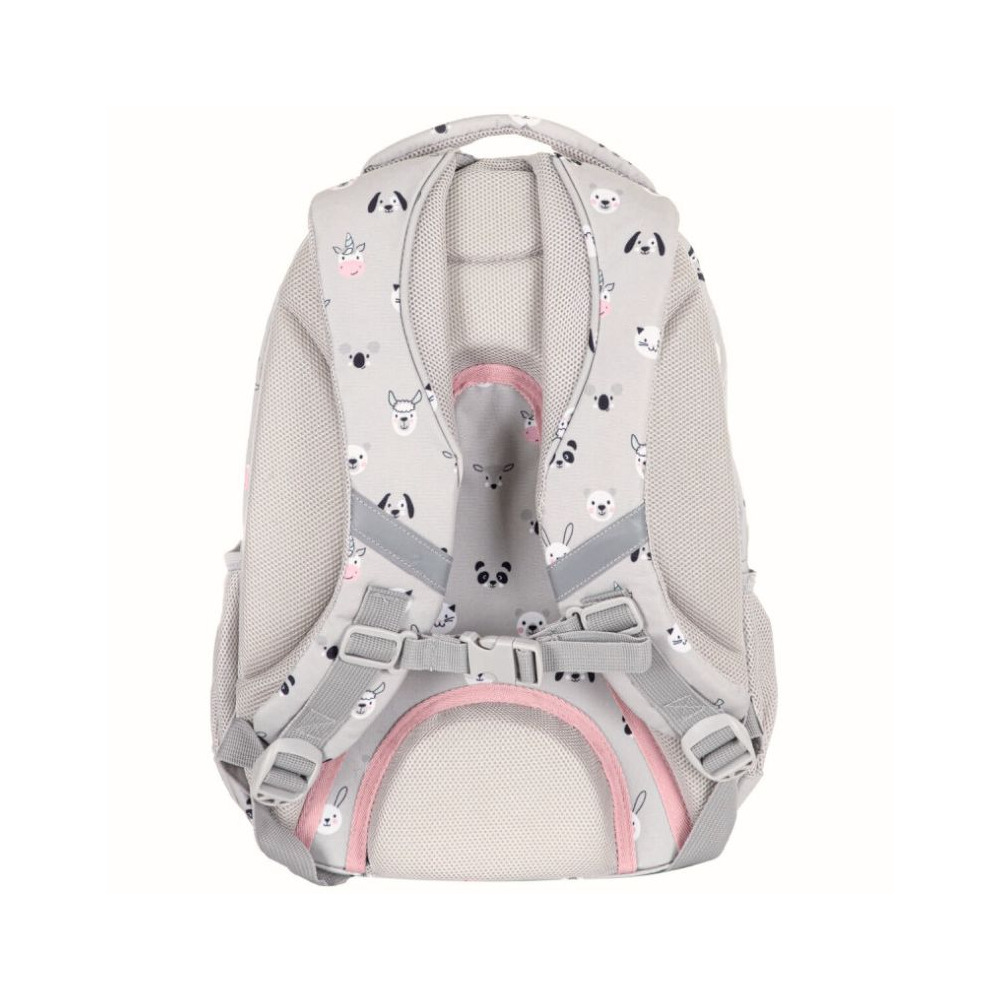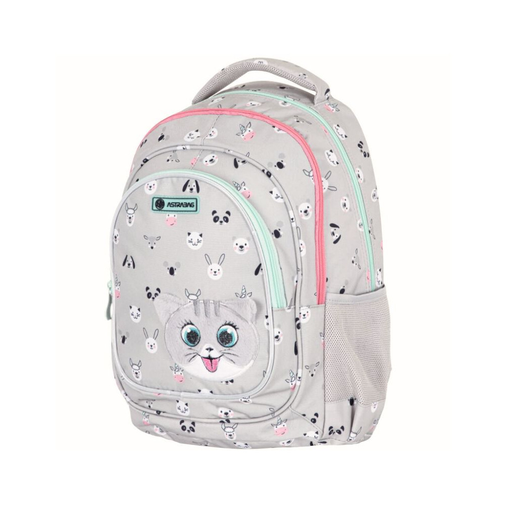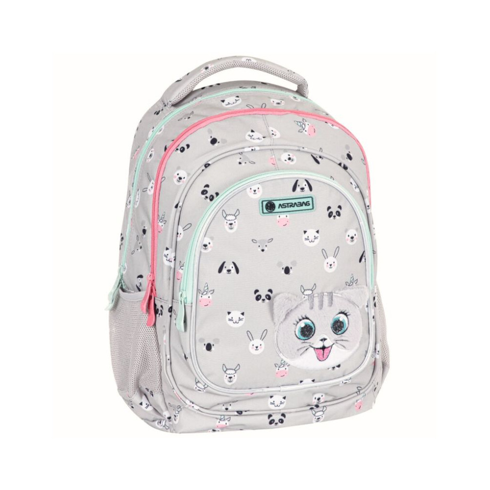 Trzykomorowy plecak Astrabag został stworzony z myślą o wszystkich miłośniczkach kotków. Na jego froncie znajduje się naszyty pluszowy pyszczek mruczka, który jest przemiły w dotyku. Dodatkowo szara kolorystyka przeplatana pastelowymi odcieniami różu i mięty skradnie serce każdej dziewczynki. Plecak wyposażony jest w trzy pojemne komory pełne praktycznych schowków. Zastosowano w nim wyjątkową technologię Ergo Back minimalizującą naciski na barki i kręgosłup oraz zapewniającą poczucie komfortu dziecka.