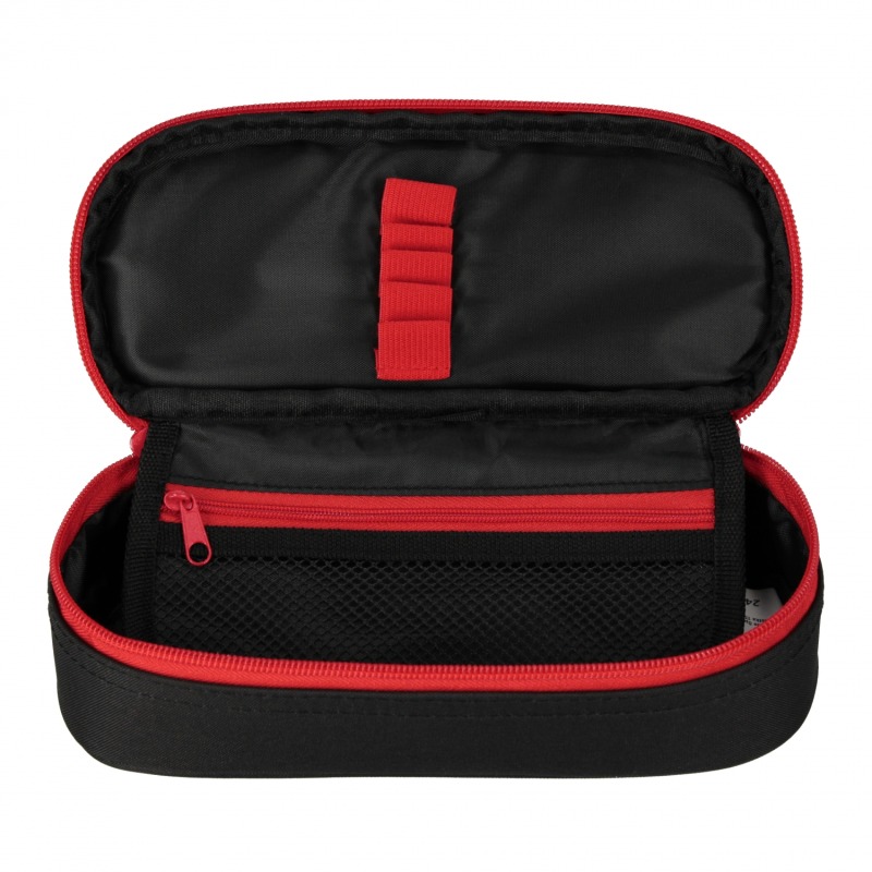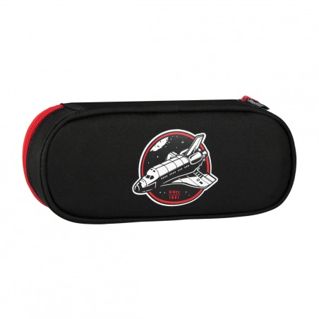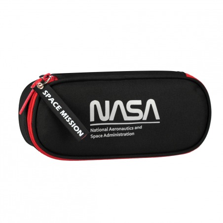 ➡️ Piórnik w kolorze czarno czerwonym z grafika NASA w kształcie saszetki z dużym zamkiem błyskawicznym.