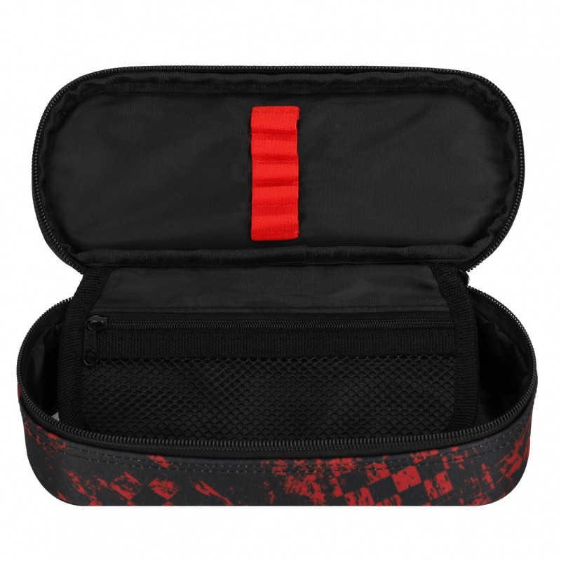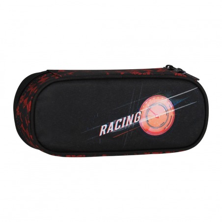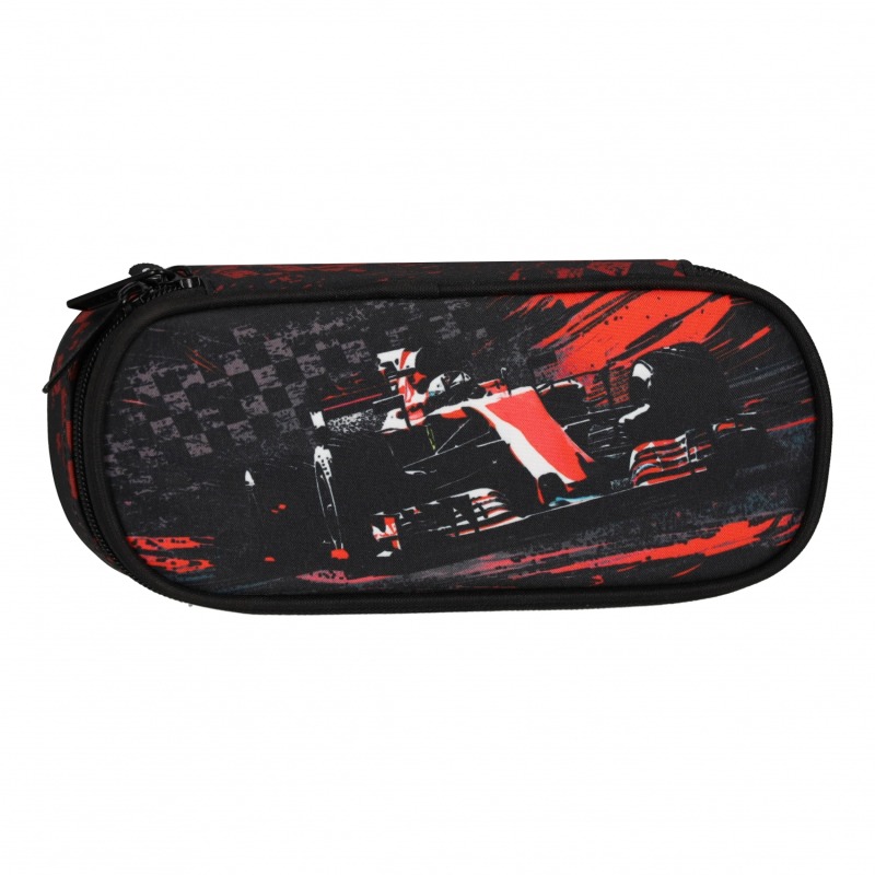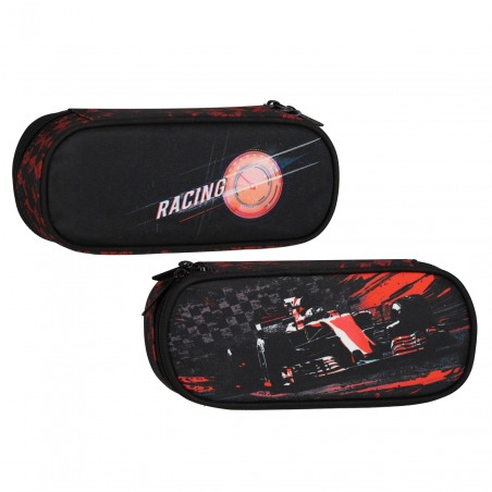 ⭐ Piórnik z grafiką samochodu wyścigowego w czarno-czerwonej kolorystyce w kształcie saszetki z dużym zamkiem błyskawicznym.