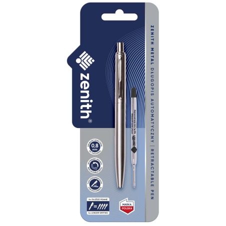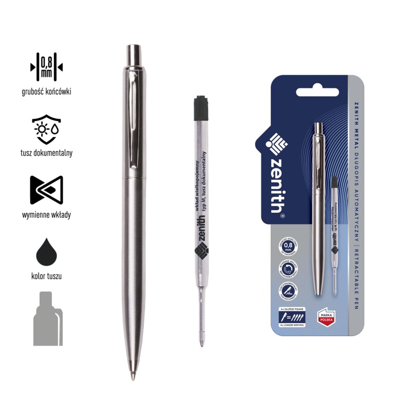 ✅ Długopis o precyzyjnym wykonaniu z wysokiej jakości materiałów, wyposażony w wymienny wkład wielkopojemny Zenith 4 z niebieskim dokumentalnym tuszem.