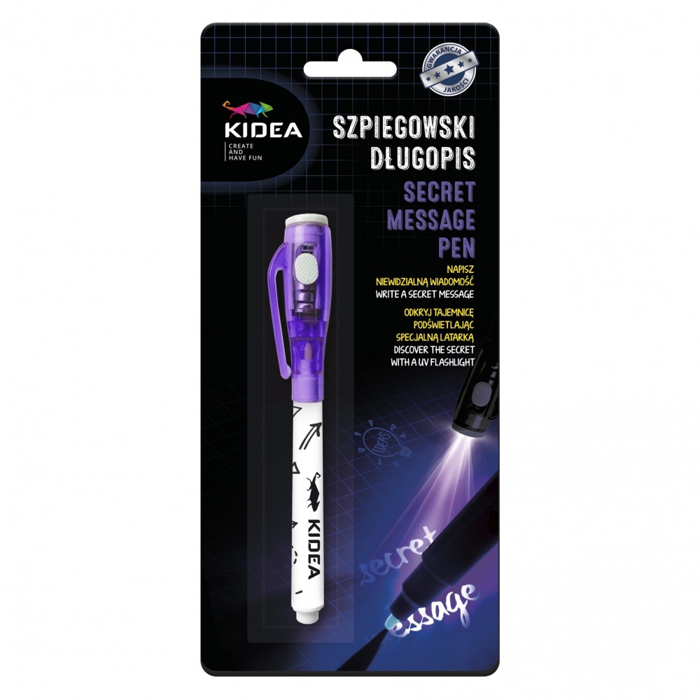 Tusz podczas pisania jest niewidoczny, aby przeczytać niewidzialną wiadomość należy podświetlić kartkę.