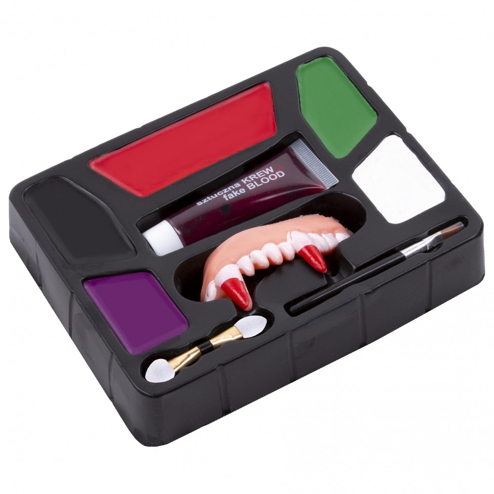 • Cały komplet zawiera aż 9 elementów: sztuczną krew, farbki do twarzy w 5 odcieniach – czarnym, fioletowym, czerwonym, zielonym i białym, sztuczną szczękę oraz pędzelek, który świetnie sprawdzi się w rysowaniu dokładnych kontur oraz aplikator do pokrycia większych powierzchni.