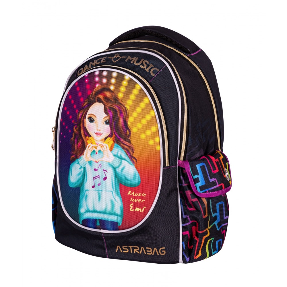 Trzykomorowy plecak Astrabag Top Teens to absolutny hit tego sezonu. Powstał z myślą o małych fashionistkach, które uwielbiają błyszczeć na szkolnych korytarzach. Jego znakami rozpoznawczymi są piękna i intensywna kolorystyka oraz duża rysunkowa grafika przedstawiająca nową ulubioną postać każdej dziewczynki – lalkę Emi.