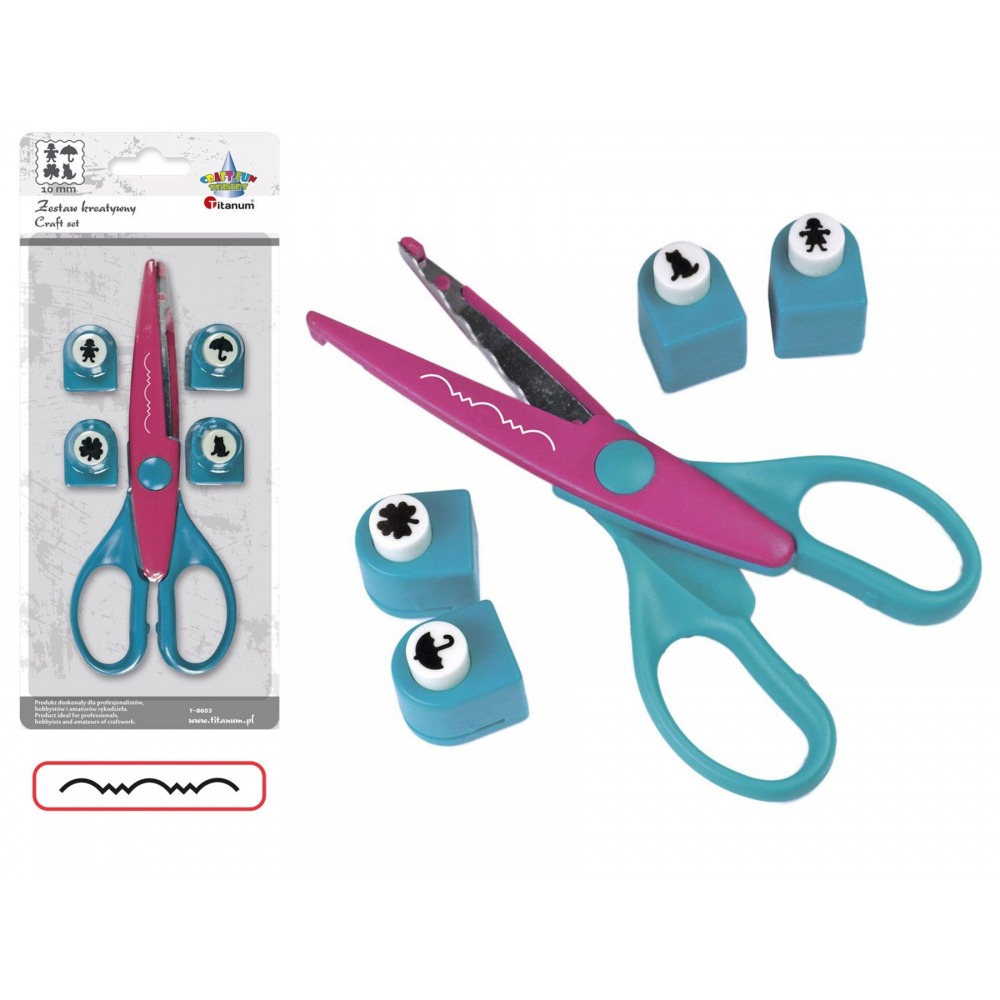 Zestaw kreatywny składający się z nożyczek oraz dziurkaczy z ozdobnymi motywami.