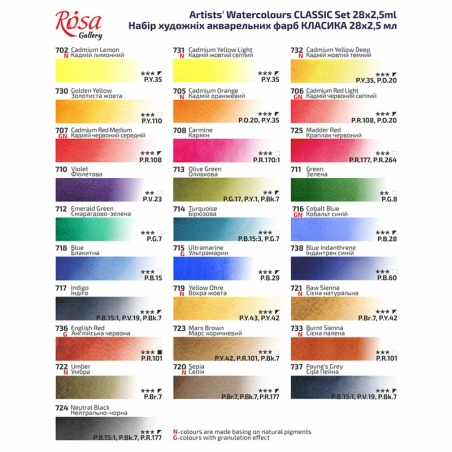 ➡️ W gamie 80 kolorów, 28 odcieni posiada efekt granulacji. Jest to niezwykła właściwość farby, która polega na tworzeniu się skupisk pigmentu na powierzchni.