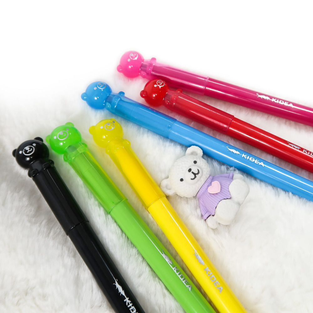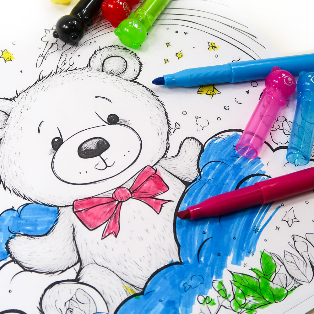 Flamastry w 6 intensywnych kolorach: żółtym, czerwonym, różowym, zielonym, niebieskim i czarnym. Zakrętki w kształcie misiów dodają flamastrom uroku, a ich zaokrąglona końcówka idealnie sprawdza się podczas rysowania, podkreślania czy pisania. Dzięki drobnym wyżłobieniom przy końcówce, flamastry są bardzo komfortowe w użytkowaniu i wygodnie leżą w dłoni.
