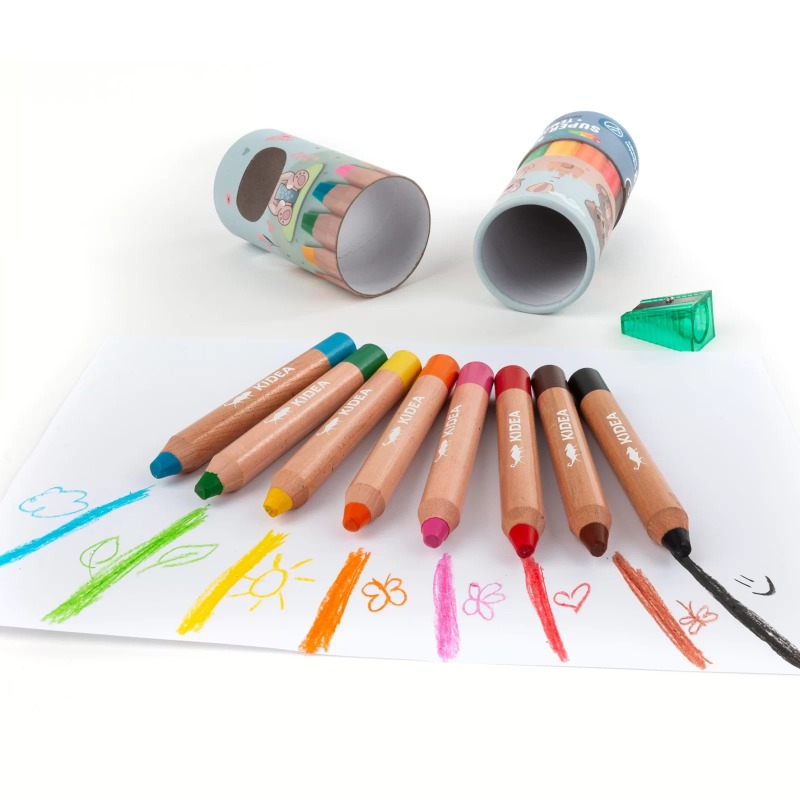 ⭐ W środku znajduje się 8 kolorów kredek idealnych wielkością pod małą rączkę oraz temperówka.