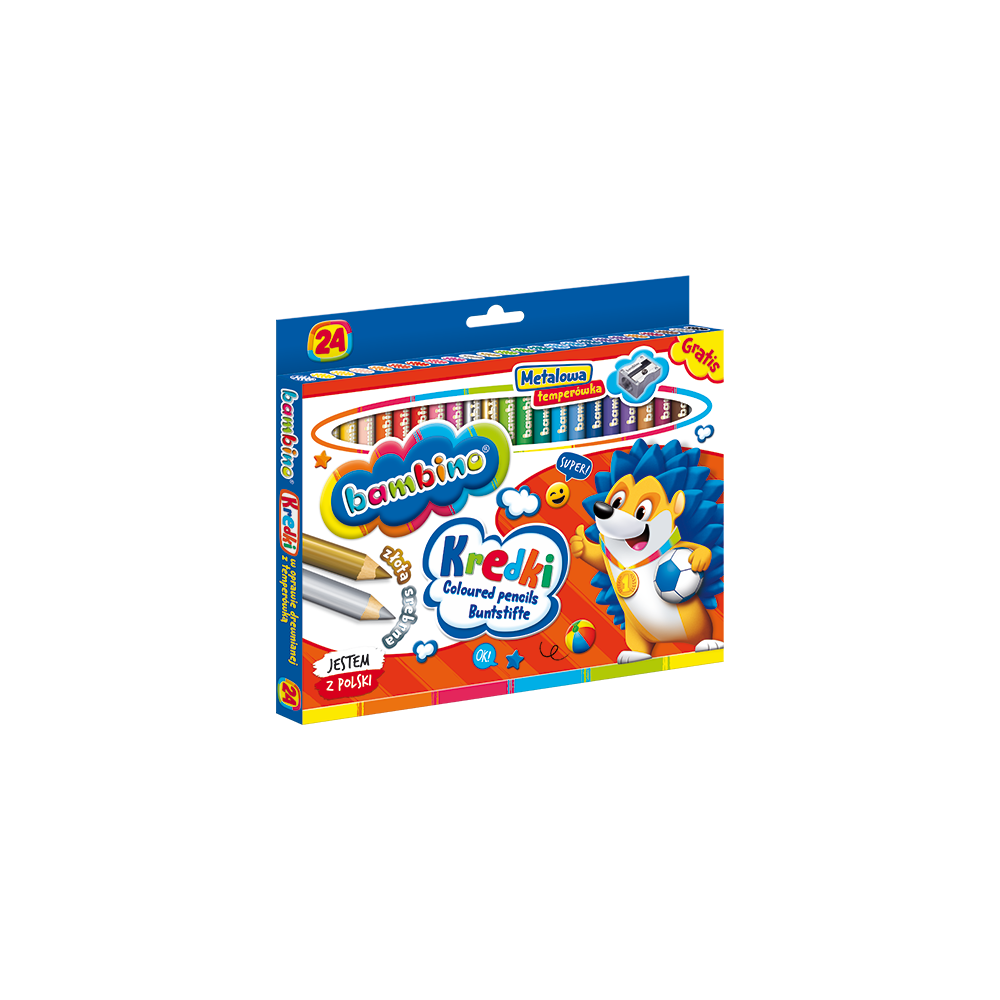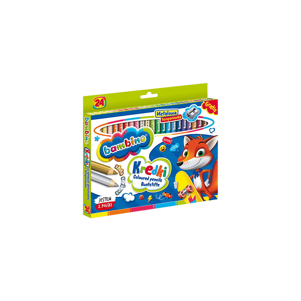 Wysokiej jakości kredki z glinki kaolinowej w drewnianej oprawie. Charakteryzują się wyjątkowo intensywnymi i nasyconymi kolorami. Doskonale kryją, idealnie nadają się do rysowania, wypełniania dużych powierzchni i wykonywania miękkich przejść pomiędzy kolorami. Kredki są grube, odpowiednio wyważone, przez co idealnie dopasowują się do małej dłoni dziecka. Produkowane są w Polsce, w zgodności z dyrektywą Parlamentu Europejskiego i Rady w sprawie bezpieczeństwa zabawek oraz rozporządzeniem Ministerstwa Gospodarki w sprawie zasadniczych wymagań dla zabawek, co gwarantuje bezpieczeństwo kredek Bambino.