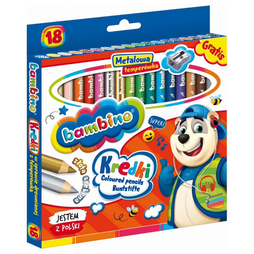Wysokiej jakości kredki z glinki kaolinowej w drewnianej oprawie. Charakteryzują się wyjątkowo intensywnymi i nasyconymi kolorami. Doskonale kryją, idealnie nadają się do rysowania, wypełniania dużych powierzchni i wykonywania miękkich przejść pomiędzy kolorami. Kredki są grube, odpowiednio wyważone, przez co idealnie dopasowują się do małej dłoni dziecka. Produkowane są w Polsce, w zgodności z dyrektywą Parlamentu Europejskiego i Rady w sprawie bezpieczeństwa zabawek oraz rozporządzeniem Ministerstwa Gospodarki w sprawie zasadniczych wymagań dla zabawek, co gwarantuje bezpieczeństwo kredek Bambino.