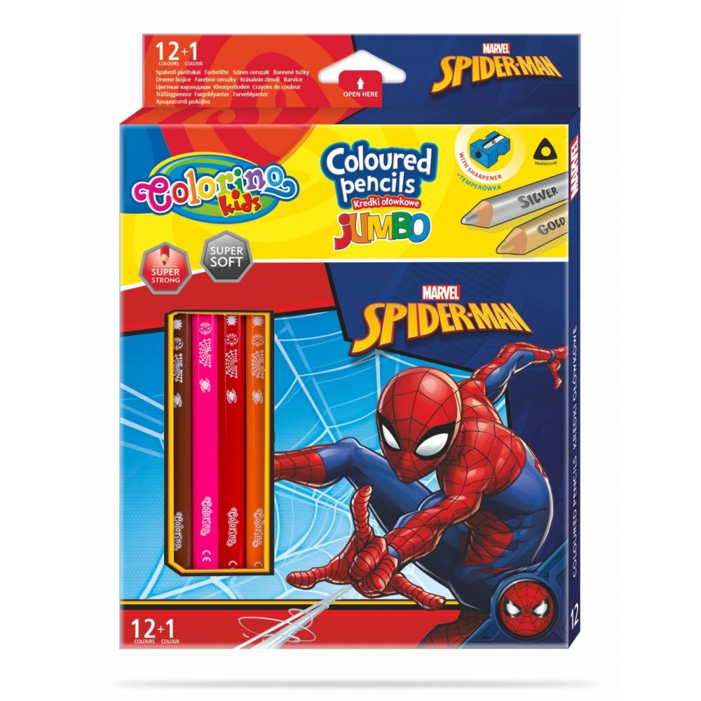 Kredki ołówkowe Jumbo Colorino Spiderman 13 kolorów w zestawie z temperówką.