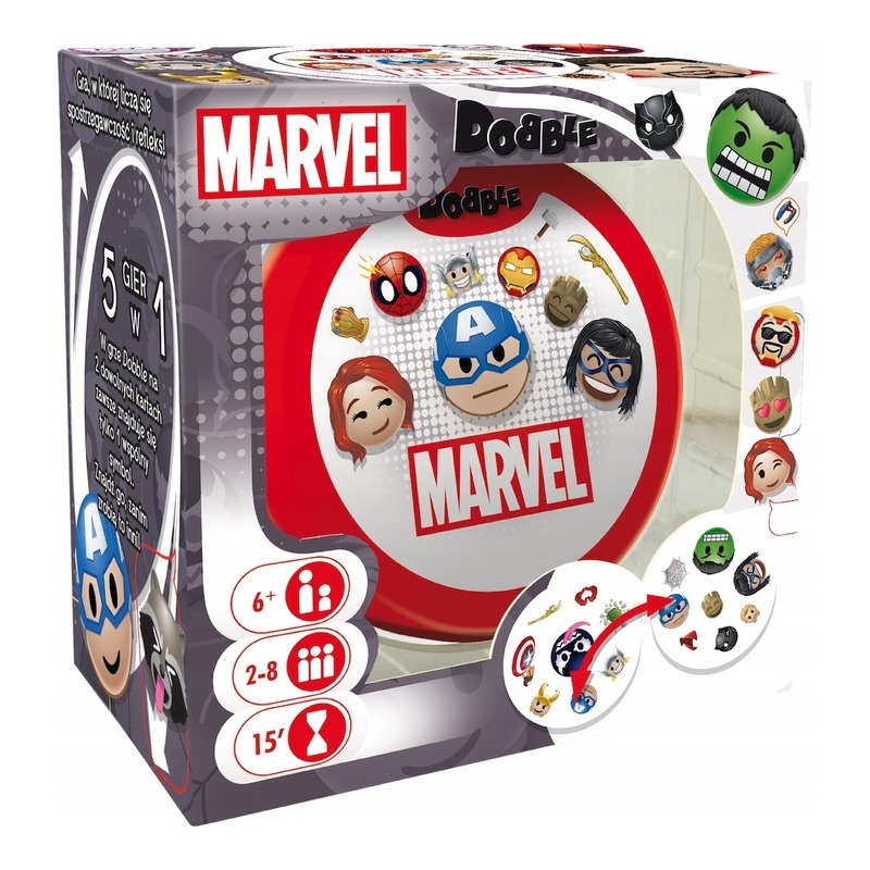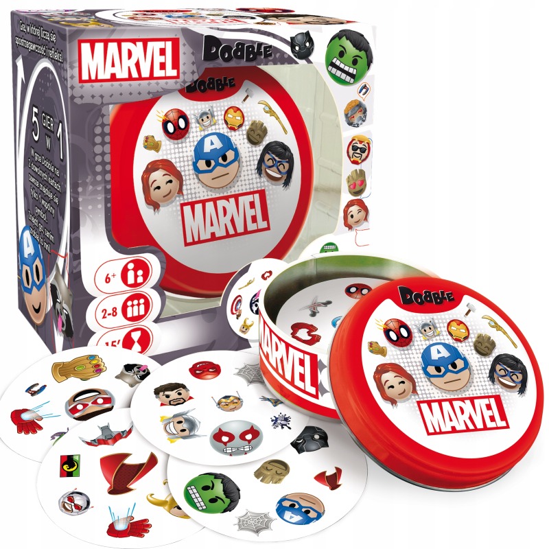 ⭐ Dzięki nawiązaniu do świata superbohaterów Dobble Marvel Emoji są świetną propozycją zarówno dla dzieci, jak i dorosłych, którzy z radością będą szukali swoich ulubionych postaci z filmów czy komiksów.