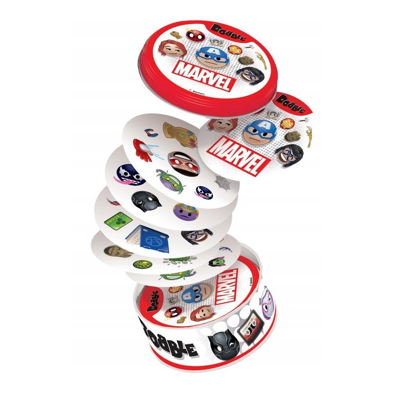 ⭐W Dobble można grać na wiele sposobów, a 5 z nich jest opisanych w instrukcji jako mini-gry. Aby utrudnić zabawę symbole na kartach bywają odwrócone i miewają różne rozmiary. Same karty są okrągłe i kolorowe, a każda z nich ma unikalny zestaw symboli związanych z postaciami Marvel Emoji.