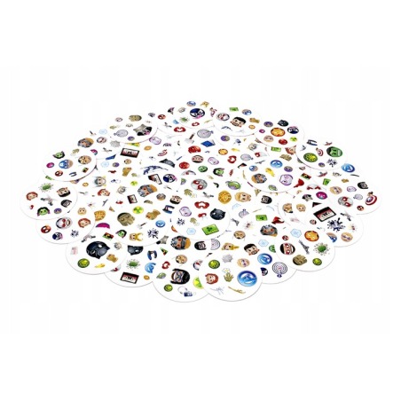 ⭐Spójrz na pierwszą kartę, którą trzymasz w ręku oraz na tę, która leży na środku stołu. Znajdź na nich wspólny symbol, nazwij go i szybko pozbądź się swojej karty. Teraz następna! Tylko nie zwątp, dwie dowolne karty zawsze łączy jeden wspólny obrazek.