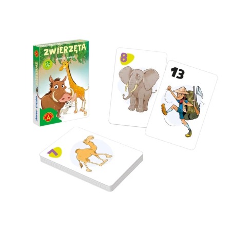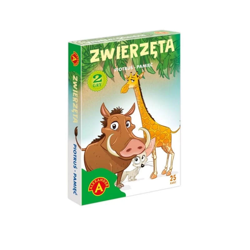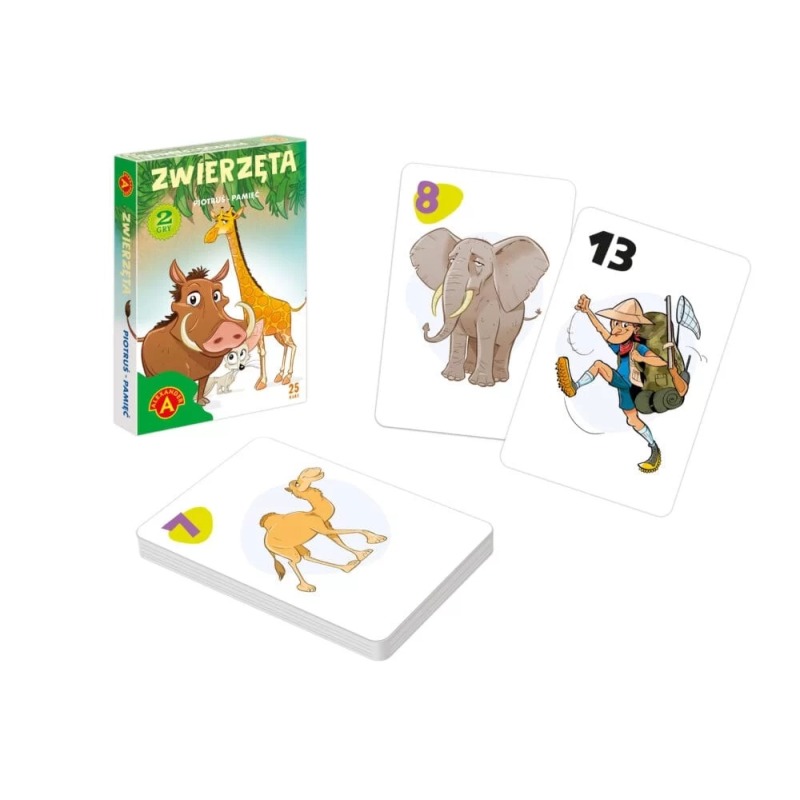 ✅ Zestaw 25 kart z obrazkami, dzięki którym można zagrać z dziećmi w dwie podstawowe gry karciane – „Piotruś” i „Pamięć”.