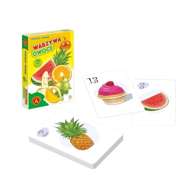 ✅ Zestaw 25 kart z obrazkami, dzięki którym można zagrać z dziećmi w dwie podstawowe gry karciane – „Piotruś” i „Pamięć”.