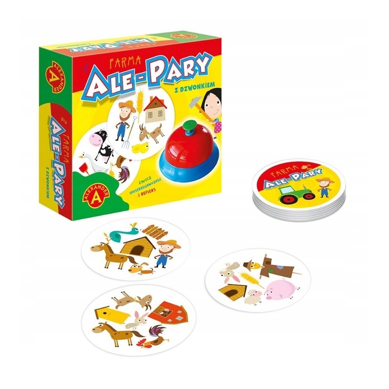 ⭐⭐ „Ale Pary z Dzwonkiem - Farma” to szalona zabawa na spostrzegawczość. Gra składa się z 31 kart, z 6 obrazkami na każdej z nich. Dwie dowolne karty mają po jednym wspólnym obrazku (ale często różnej wielkości). Gra polega na jak najszybszym znalezieniu wspólnego obrazka. Kto pierwszy zobaczy wspólny obrazek na swojej karcie i karcie leżącej na środku stołu uderza w dzwonek i wypowiada nazwę obrazka. Następnie odkłada swoją kartę na wierzch stosu. Zabawa jest świetnym treningiem analizy wzrokowej, umiejętności postrzegania, rozróżniania szczegółów i refleksu. Rekwizyt w postaci dzwonka, który kochają wszystkie dzieci. Dwa warianty zabawy. Możemy bawić się z dzwonkiem, lub bez co również dostarcza super zabawę⭐⭐