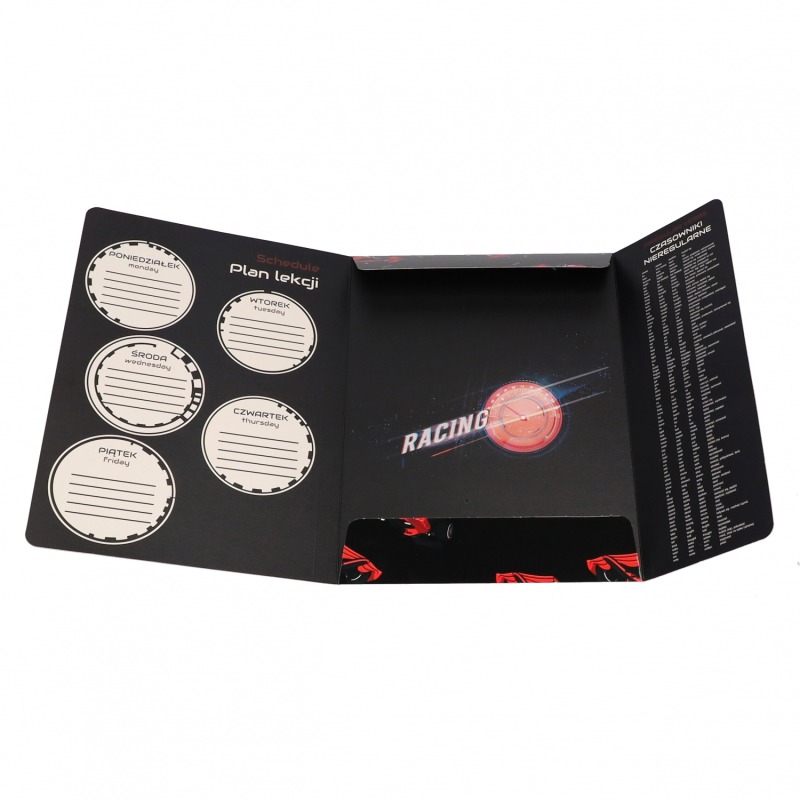 ✅ Teczka jest laminowana, dzięki temu bardziej trwała i ozdobiona kolorową grafiką aut, występuje w dwóch wariantach.