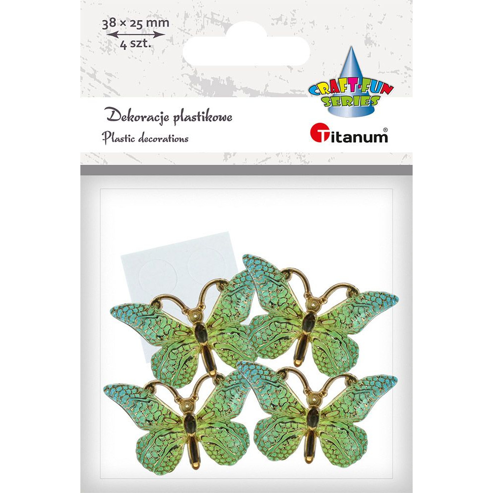 Dekoracje samoprzylepne plastikowe, wzór: motyle, wymiary: 38x23 mm, zielono-złote, 4 sztuki.