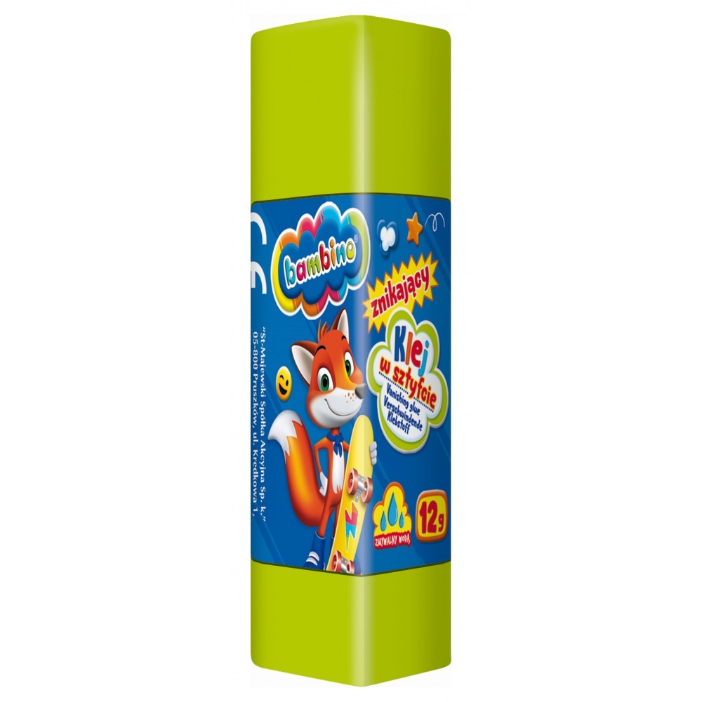 Kolorowy klej, który po wyschnięciu staje się transparenty. Dzięki zabarwieniu potraktowana klejem powierzchnia jest dobrze widoczna, co ułatwia przyklejanie drobnych elementów zwłaszcza małym dzieciom. Dodatkowo trójkątny kształt tubki umożliwia precyzyjną aplikację kleju. Doskonały do papieru i cienkiej tektury. Zdobiony motywami wzorniczymi BAMBINO.