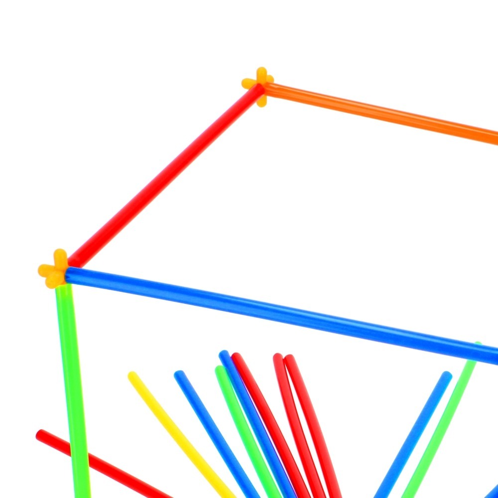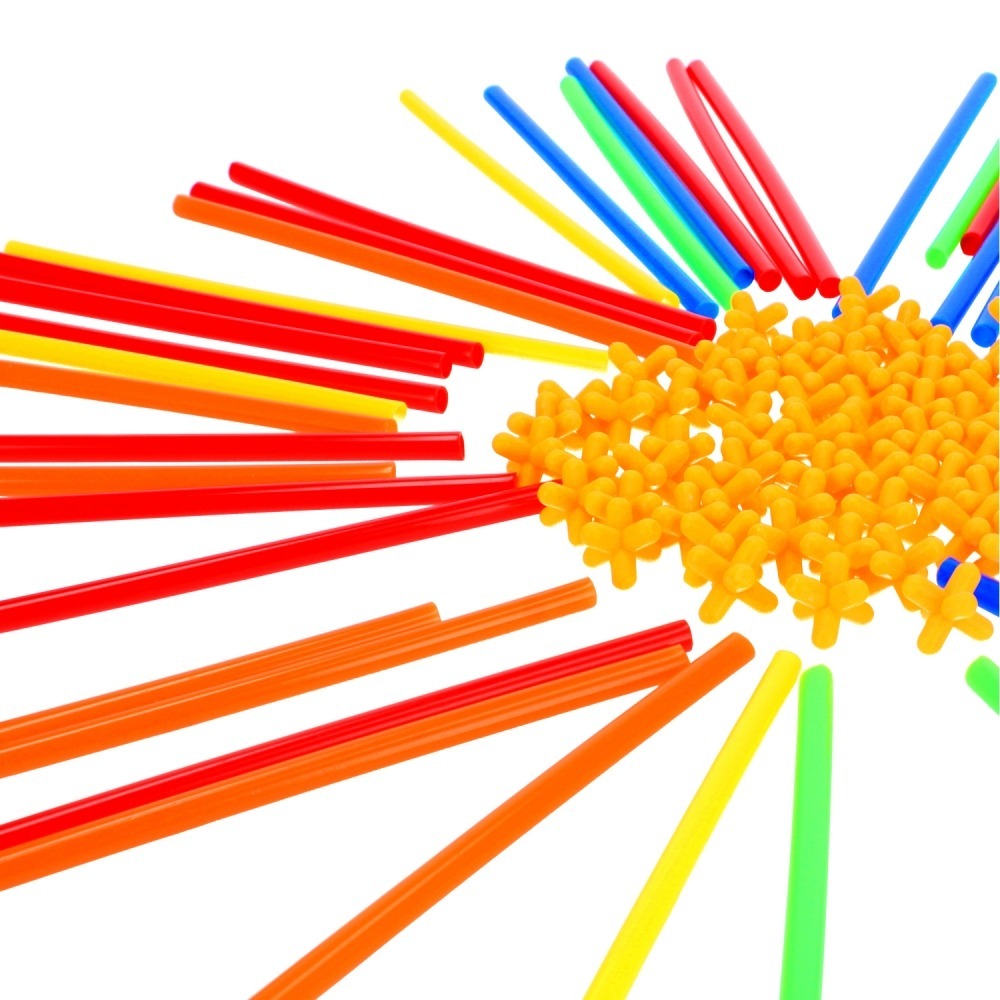 Zawartość zestawu: 108 elementów kolorowych klocków w kształcie słomek do napojów oraz złączeń do słomek.