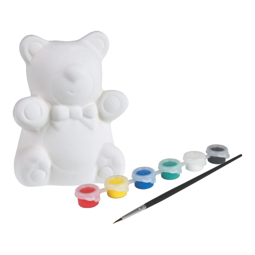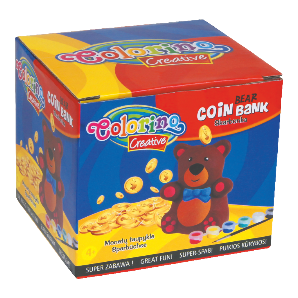 Ceramiczna skarbonka z farbkami. Stwórz oryginalną i niepowtarzalną dekorację. Naszkicuj ołówkiem wzór, pomaluj i poczekaj aż wyschnie. Skarbonkę można dodatkowo ozdobić używając np. kleju i brokatu, wydrapując wzór, itp.