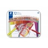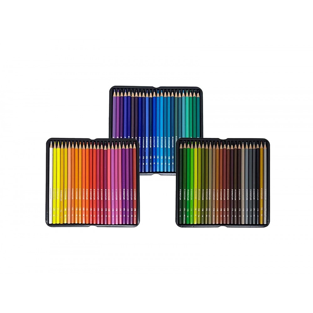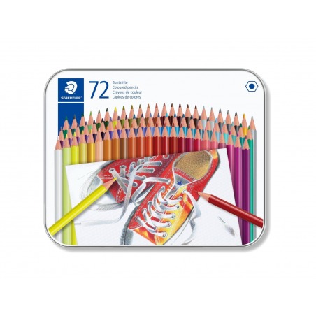 Wysokiej jakości kredki ołówkowe, sortowane na trzech plastikowych tackach i zapakowane w estetyczne metalowe pudełko. Kredki Staedtler to tęcza 72 barw charakteryzujących się wyjątkowo intensywnymi i nasyconymi kolorami. Doskonale kryją, idealnie nadają się do rysowania, wypełniania dużych powierzchni i wykonywania miękkich przejść pomiędzy kolorami. Klasyczne sześciokątne kredki ołówkowe w oprawie z drewna cedrowego, dzięki czemu są odporne na uszkodzenia mechaniczne, co wydłuża okres użytkowania. Posiadają miękki grafit łatwy do temperowania zwykłą temperówką.
