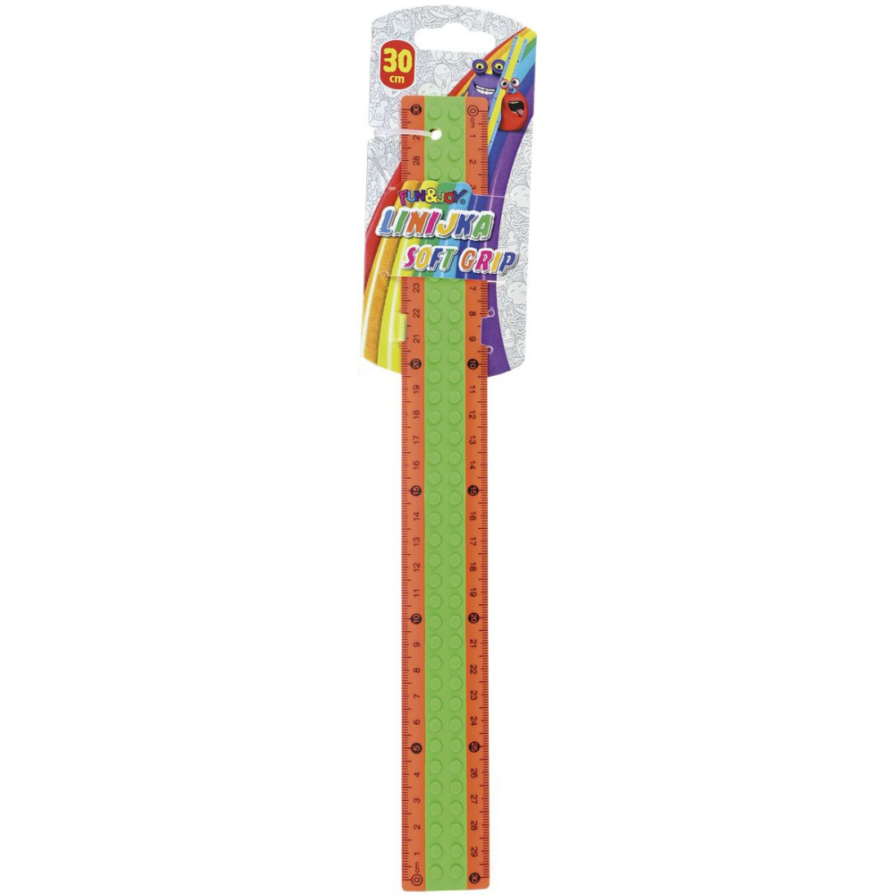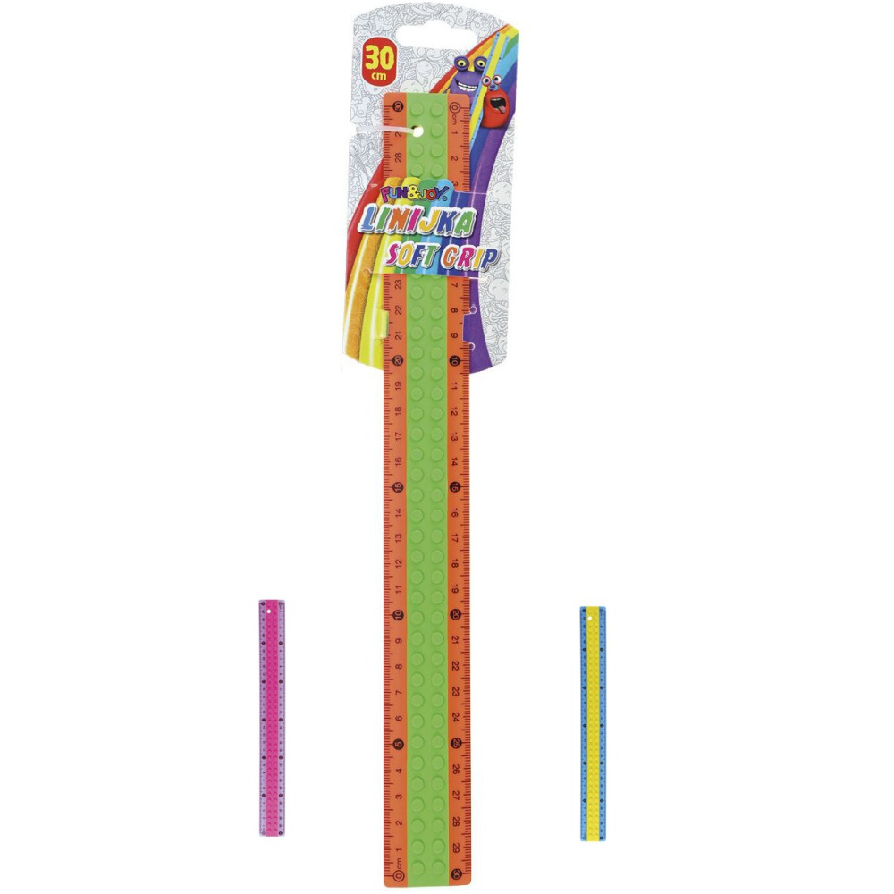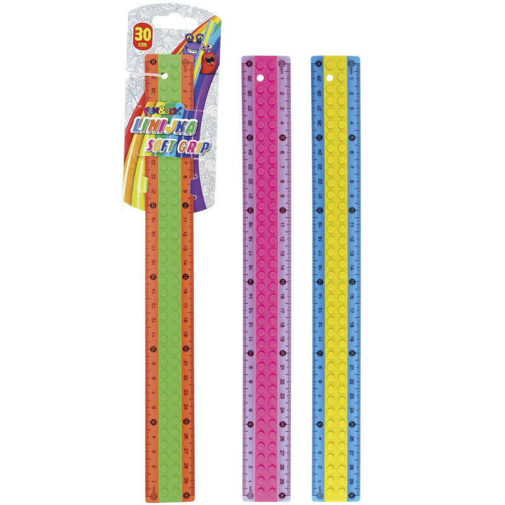 Elastyczna linijka z obudową soft grip. Okrągłe, gumowe wypustki ułatwiające trzymanie. Spód linijki z antypoślizgową gumą zapobiegającą przesuwaniu. Wysyłamy losowy kolor.