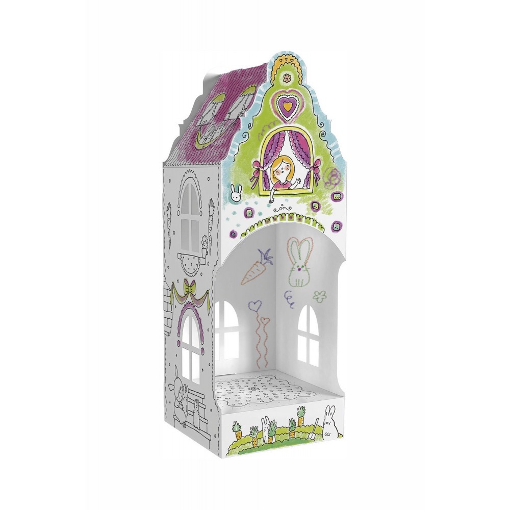 Przestrzenny domek-kolorowanka wykonany z wytrzymałego, białego kartonu.