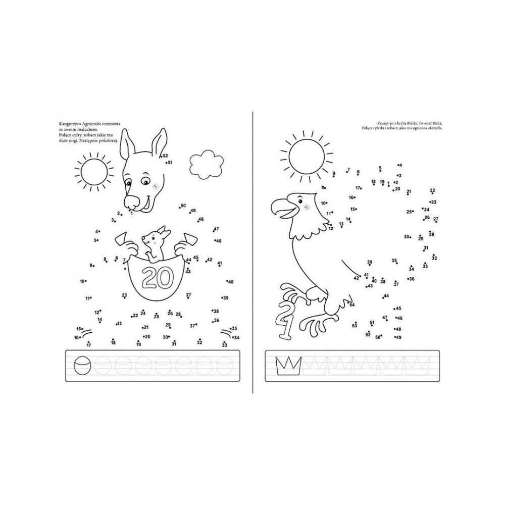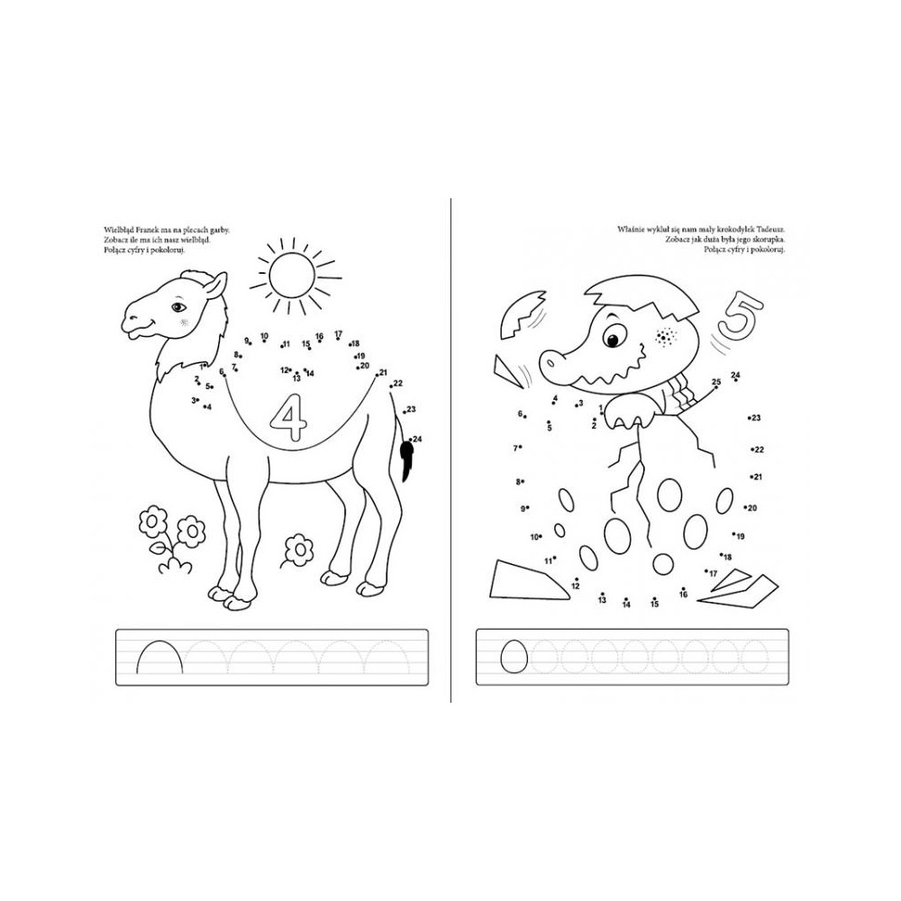 • Pod cyferkami chowają się portrety ulubionych zwierzątek, po rozwiązaniu kolejnych zadań mały artysta odkrywa postaci żółwika Bogusia, pingwina Henia, wielbłąda Franka czy foczki Kamili: może je teraz w dowolny sposób kolorować, rozwijając uzdolnienia plastyczne.