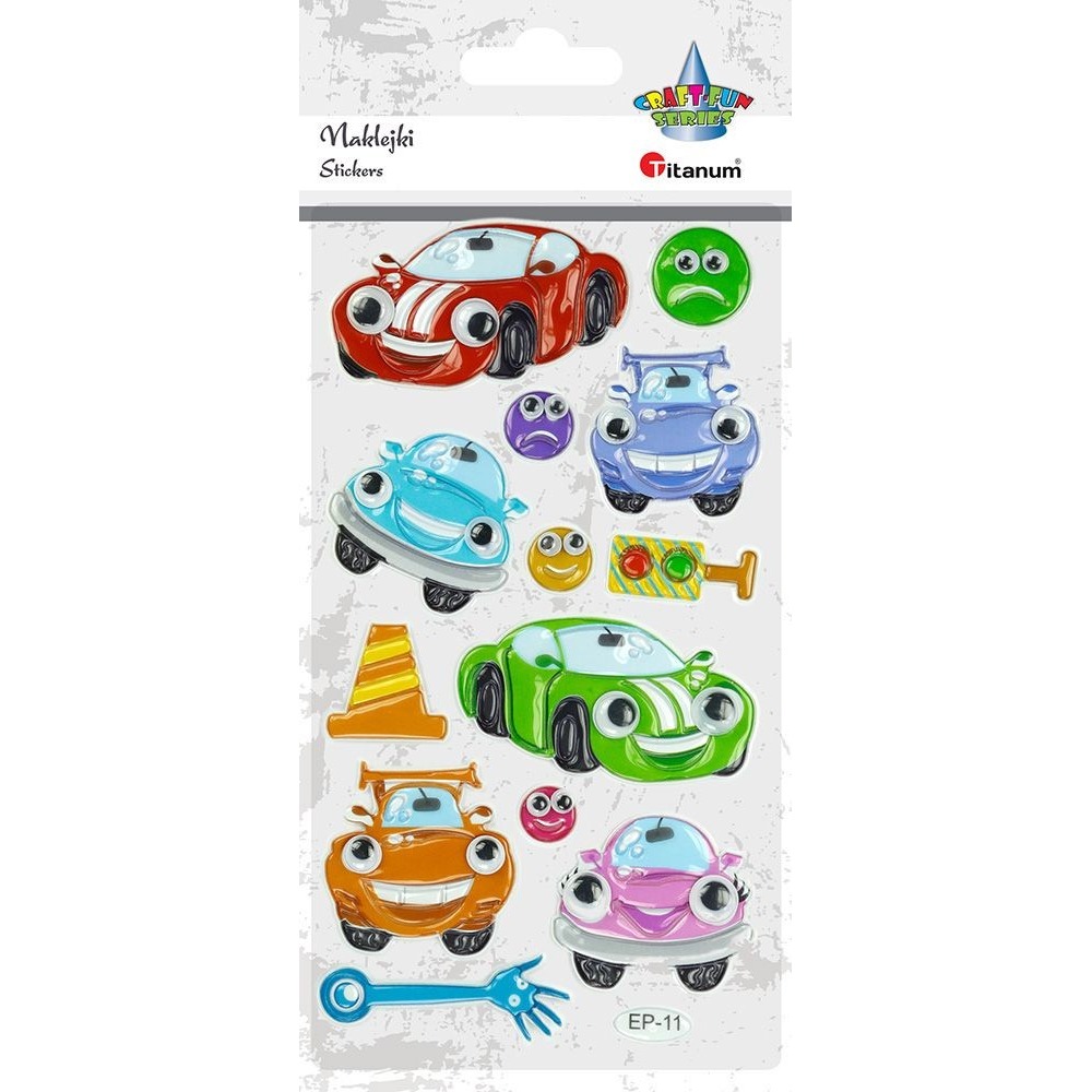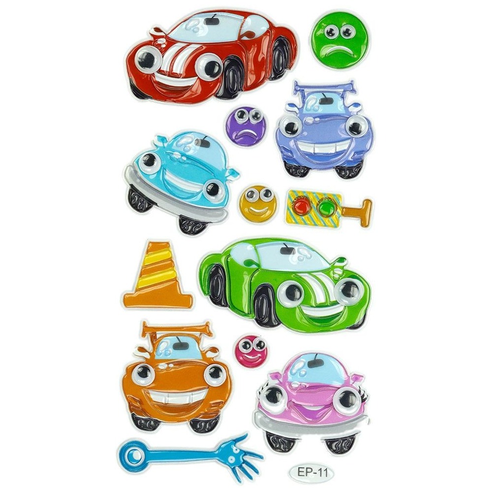 • Naklejki wypukłe. Wzór: pojazdy z ruchomymi oczami. 13 sztuk.