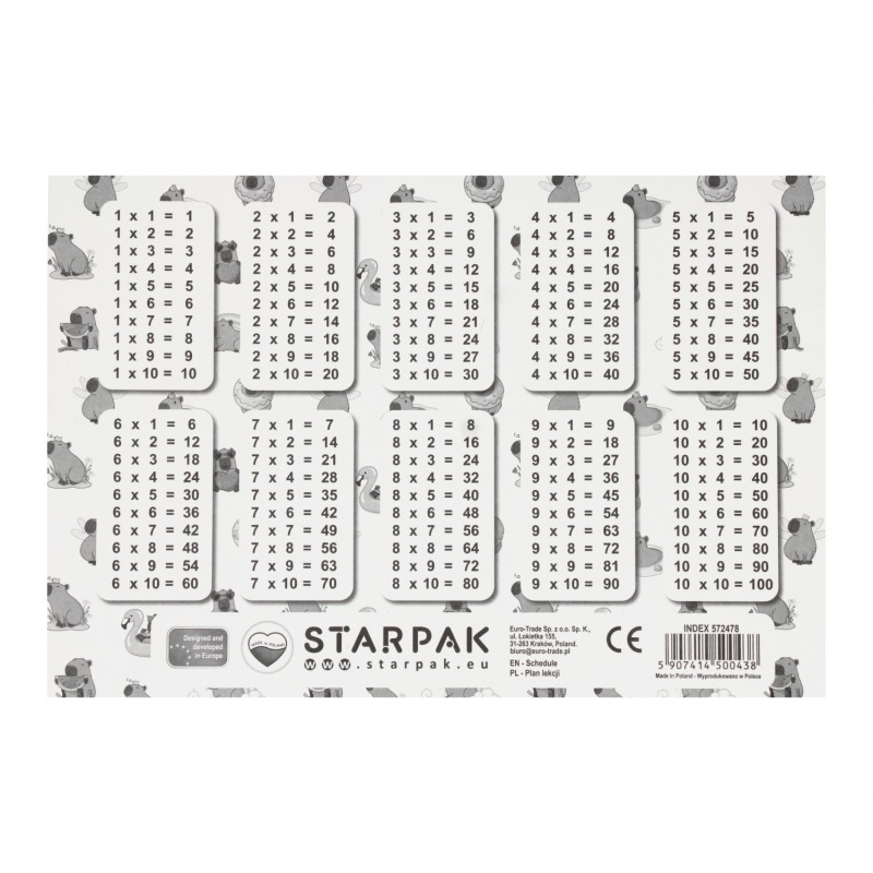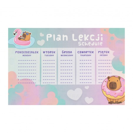 ⭐ Plan z kolekcji Starpak Kapibara, zawiera podział na pięć dni tygodnia z 8 wierszami do wpisu, dzięki czemu żaden uczeń nie zapomni o potrzebnych mu danego dnia książkach czy zeszytach, dodatkowo na odwrotnej stronie posiada tabliczkę mnożenia.