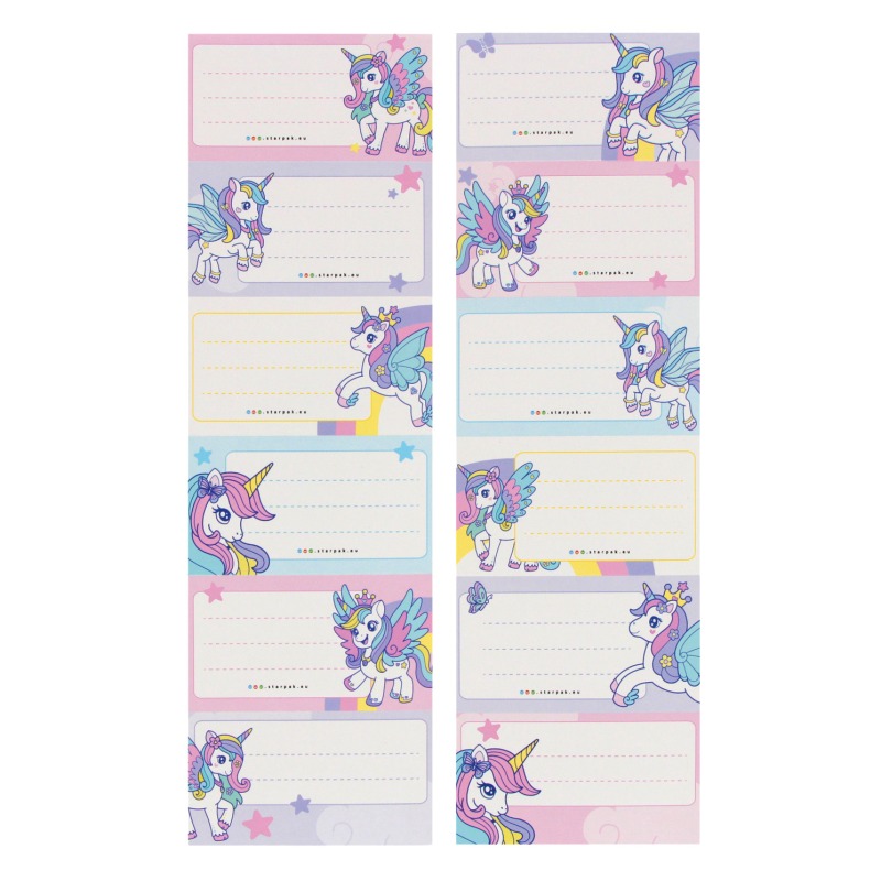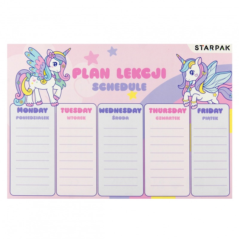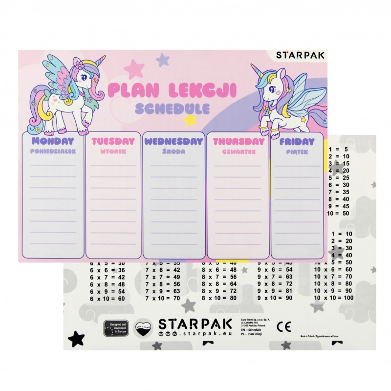 ⭐ Plan lekcji z naklejkami z kolekcji STARPAK Unicorn, plan zawiera podział na pięć dni tygodnia z 8 wierszami do wpisu, dzięki czemu żaden uczeń nie zapomni o potrzebnych mu danego dnia książkach czy zeszytach, dodatkowo na odwrotnej stronie posiada tabliczkę mnożenia, 3x zestaw naklejek na zeszyt.